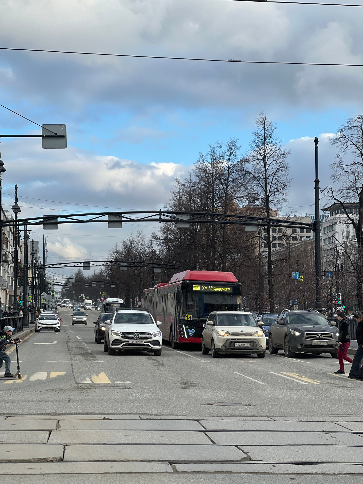 The image depicts a busy street scene in Perm, Russia. A line of cars and a bus are stopped in traffic on a wide avenue paved with stone. Pedestrians can be seen crossing the street near the crosswalk…read more