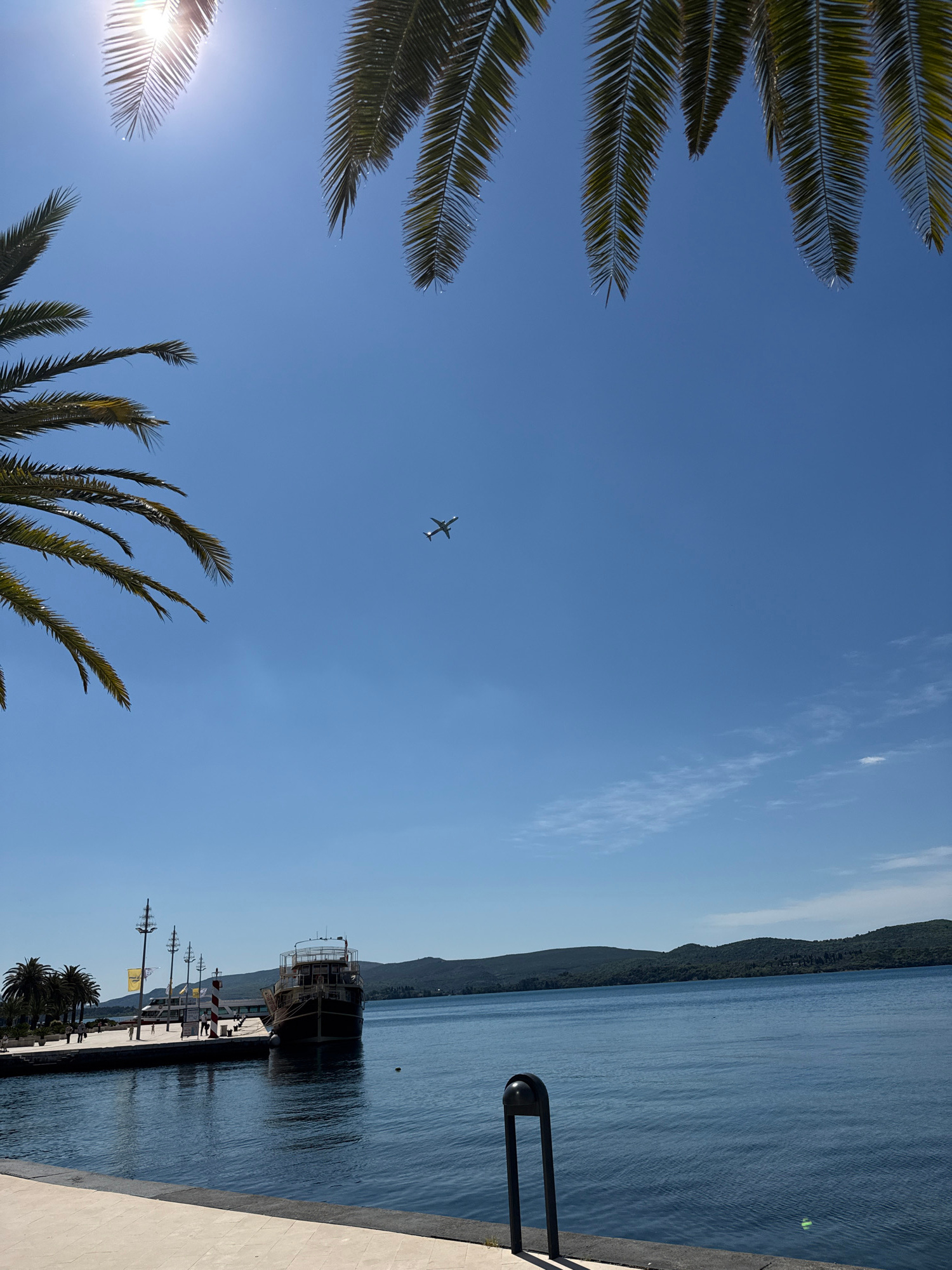 The image shows a view of Tivat, Montenegro, featuring a bright blue sky with wisps of clouds. A small airplane is visible in the center of the sky. In the foreground, palm trees frame the bottom and…read more
