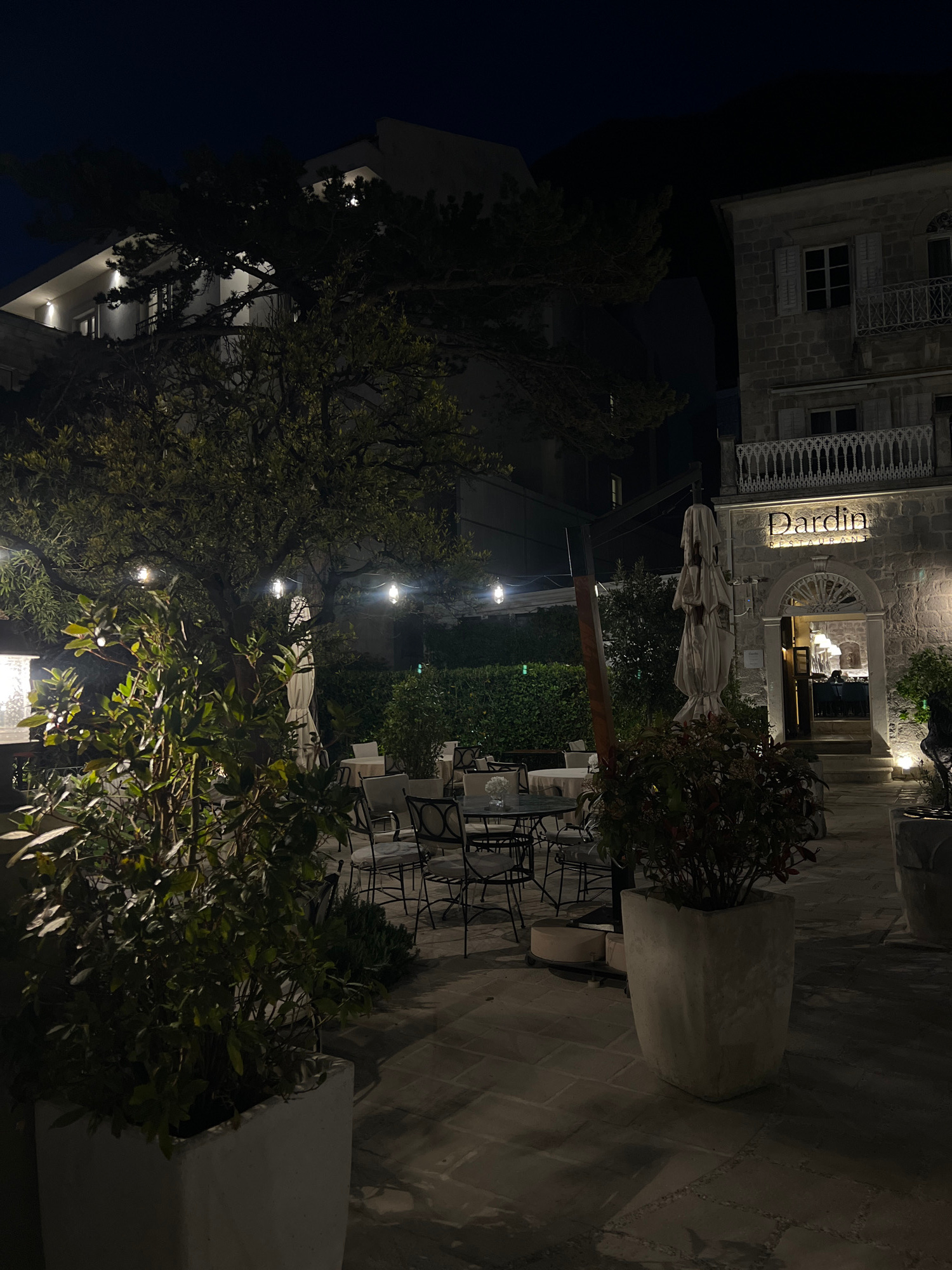Captured at night, the image presents an outdoor dining space, likely a restaurant, in Perast, Montenegro. The "Dardin" restaurant is visible, situated in a stone building with an arched entryway. Tab…read more