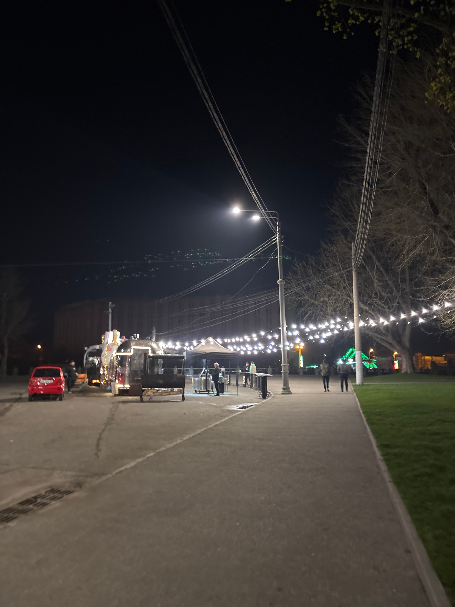 The image depicts a nighttime scene on a paved pathway in Kharkiv, Ukraine. The pathway is bordered by a green grass area on the right and dark foliage and trees on the left. Above the pathway, strand…read more