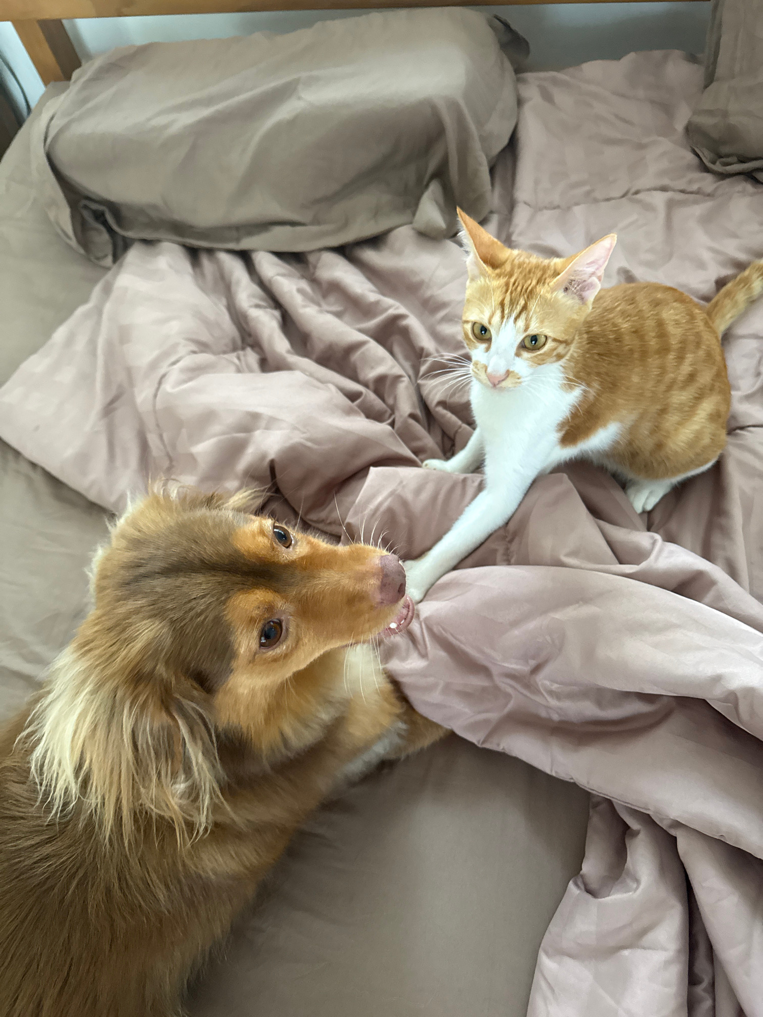 A light orange and white tabby cat and a golden-haired dog are lying on a rumpled beige bedspread. The cat, positioned in the upper left of the frame, has its paw touching the dog’s nose. The dog is i…read more