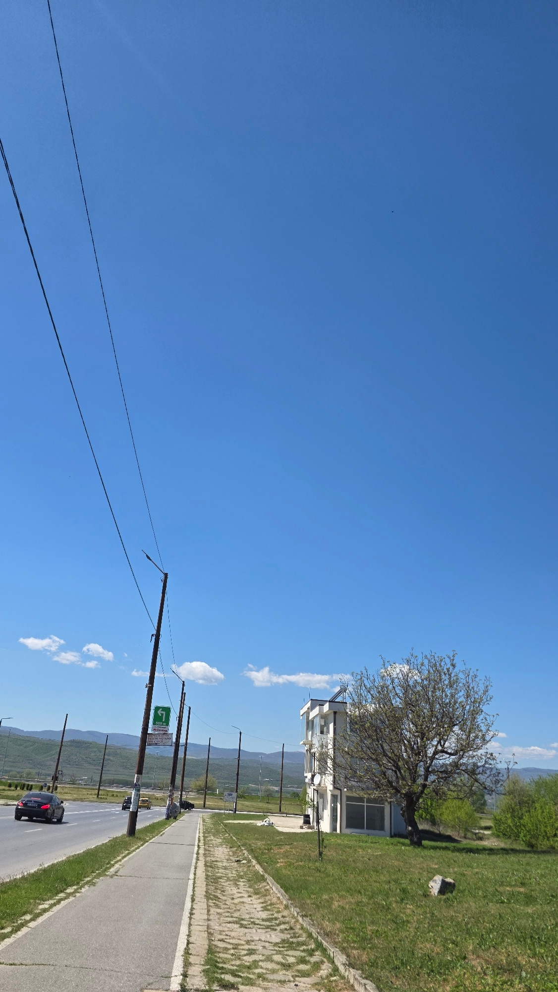 The image depicts a street scene in Blagoevgrad, Bulgaria on a clear day. The sky is blue with scattered cumulus clouds. A two-lane road with a sidewalk and grassy area runs along the right side of th…read more