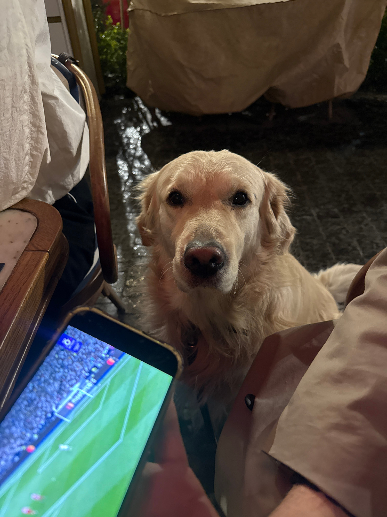 The image shows a golden retriever dog looking at the camera. In the lower right of the frame, a person is holding a mobile phone, which displays a soccer game screen. The surrounding environment indi…read more
