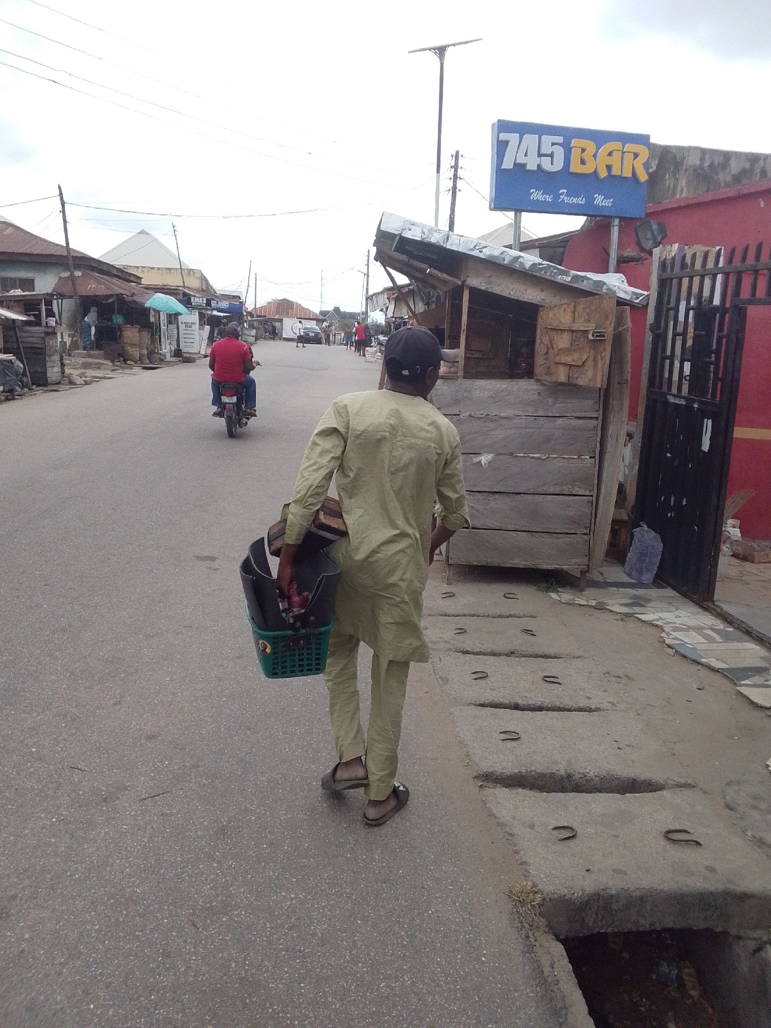 A street scene in Lokoja, Nigeria. A man wearing a light green tunic and pants and sandals, and a black baseball cap, carries a green plastic basket filled with items on his left arm as he walks away…read more