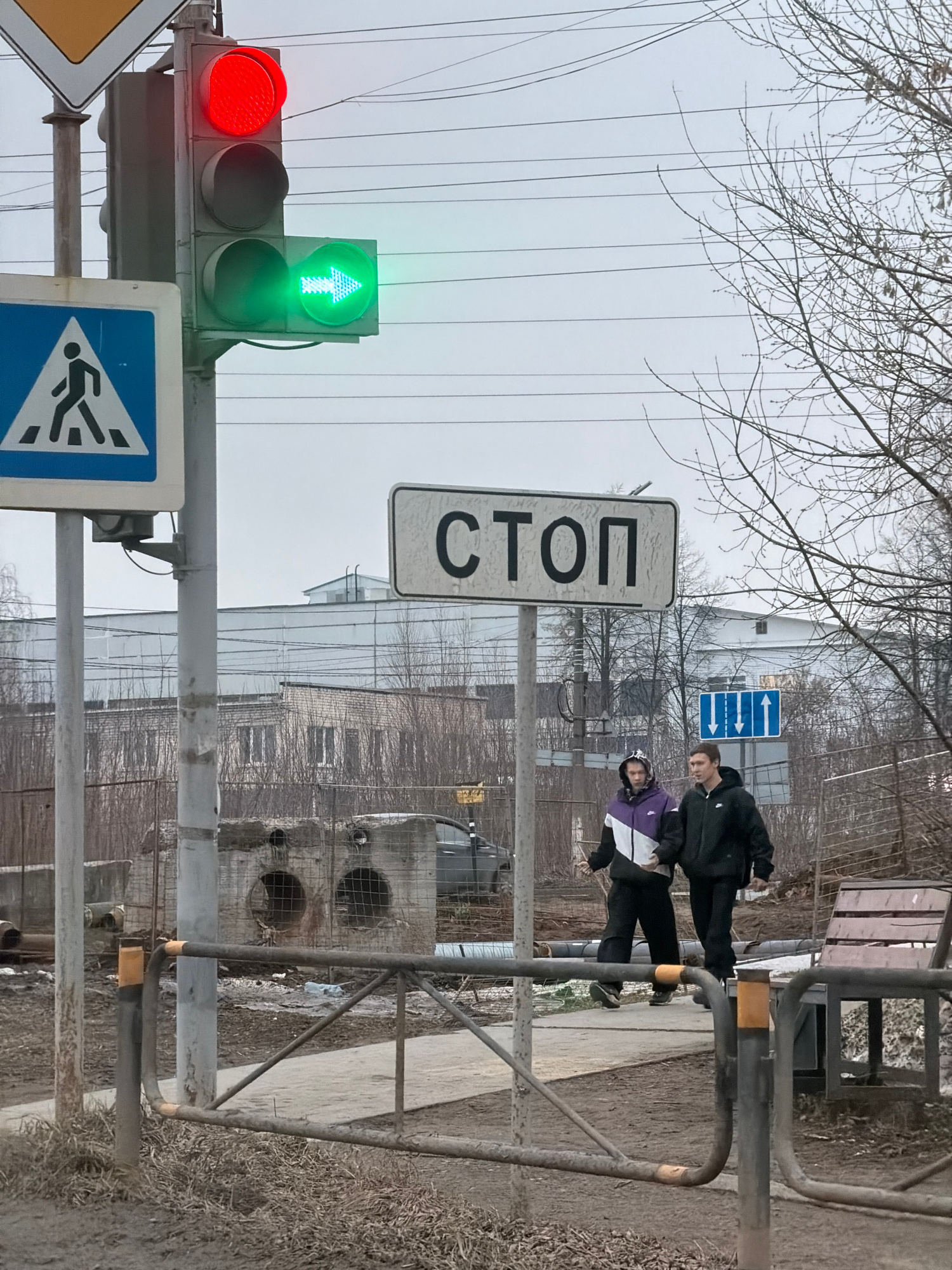 Scene: A street view in Chaikovsky, Russia. Objects: A traffic light with a red light lit at the bottom and a green arrow pointing upwards lit at the top. Beside the traffic light is a 'STOP' sign in…read more