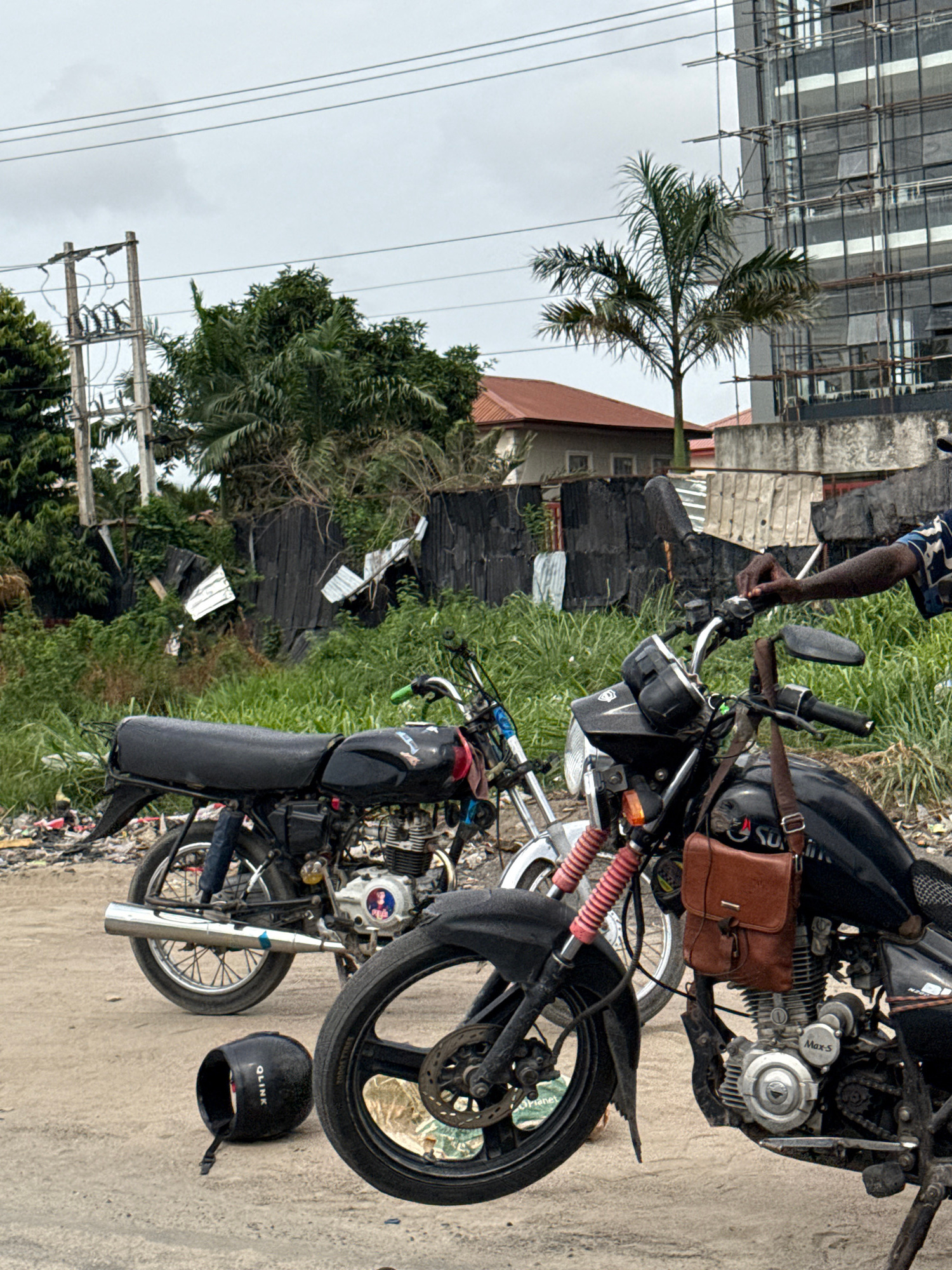 The image shows two motorcycles parked on a concrete surface next to a grassy area littered with trash. A partially visible person stands near the handlebars of the front motorcycle. A black helmet la…read more