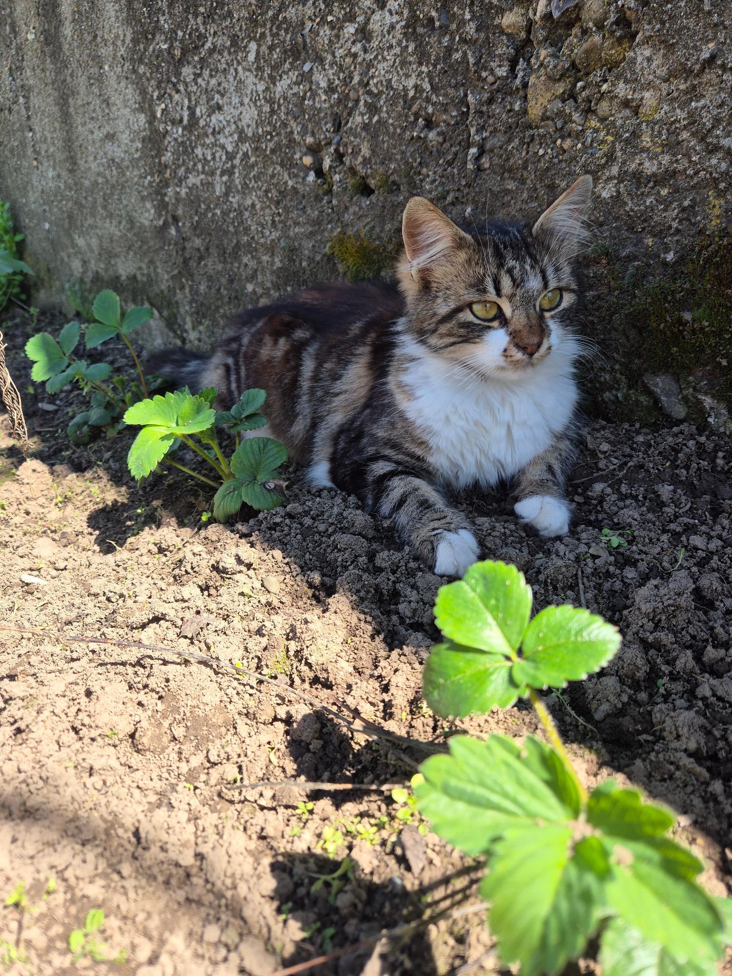 The image depicts a young tabby cat with white fur on its chest lying in a patch of dirt next to a concrete structure. The cat is looking upwards towards the camera. Several plants with three-leaf clusters are growing in the soil. The setting appears to be outdoors, possibly a garden. Staroseltsi, Bulgaria is assumed as the location of where the image was captured. | Open Wire