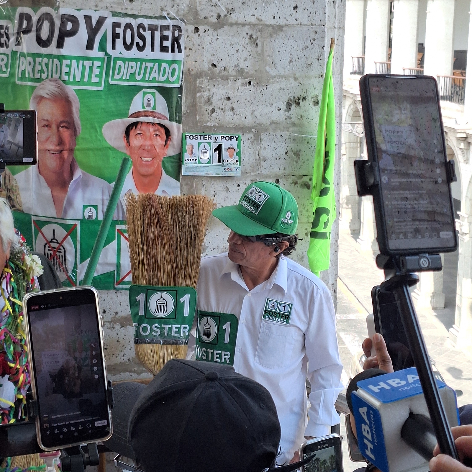 The image shows a political rally in Arequipa, Peru. There are people recording the event with their smartphones. A man in a white shirt, wearing a green cap with a political logo is present. There are political posters with the names "POPY FOSTER" displayed on the walls. A broom with a political sticker on it is also visible. A news crew with an HBA microphone is recording the event. Colorful decorations are strewn on the ground. | Open Wire