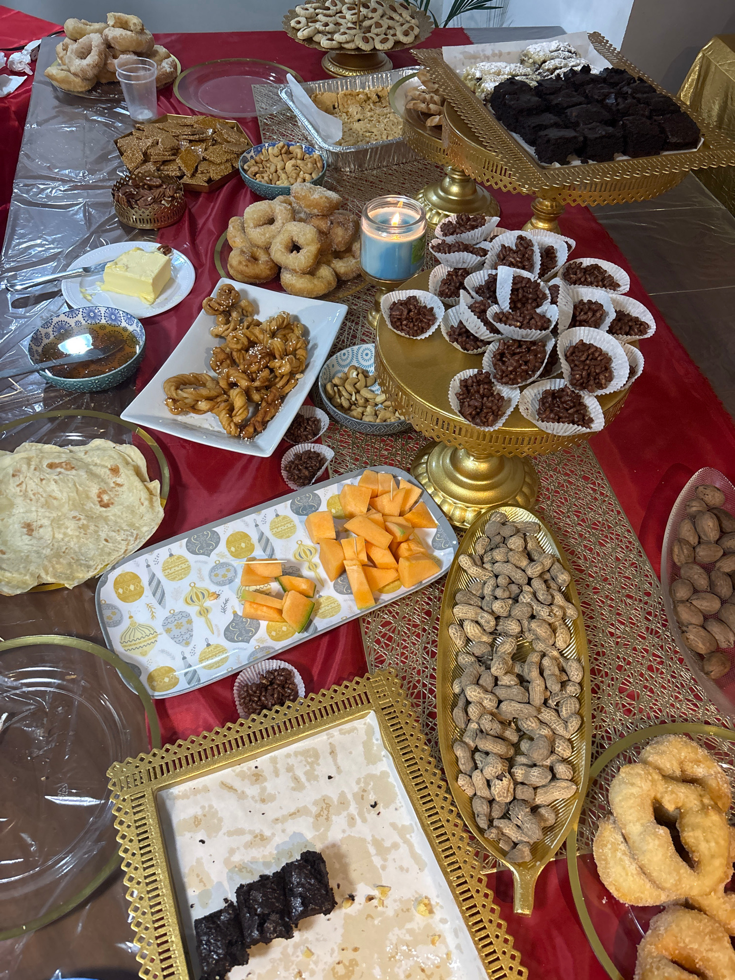 A high-angle shot shows a table laden with a variety of foods. The table is covered with a red cloth, partially obscured by a gold-patterned runner. On the left, a gold stand holds brownies and powder…read more