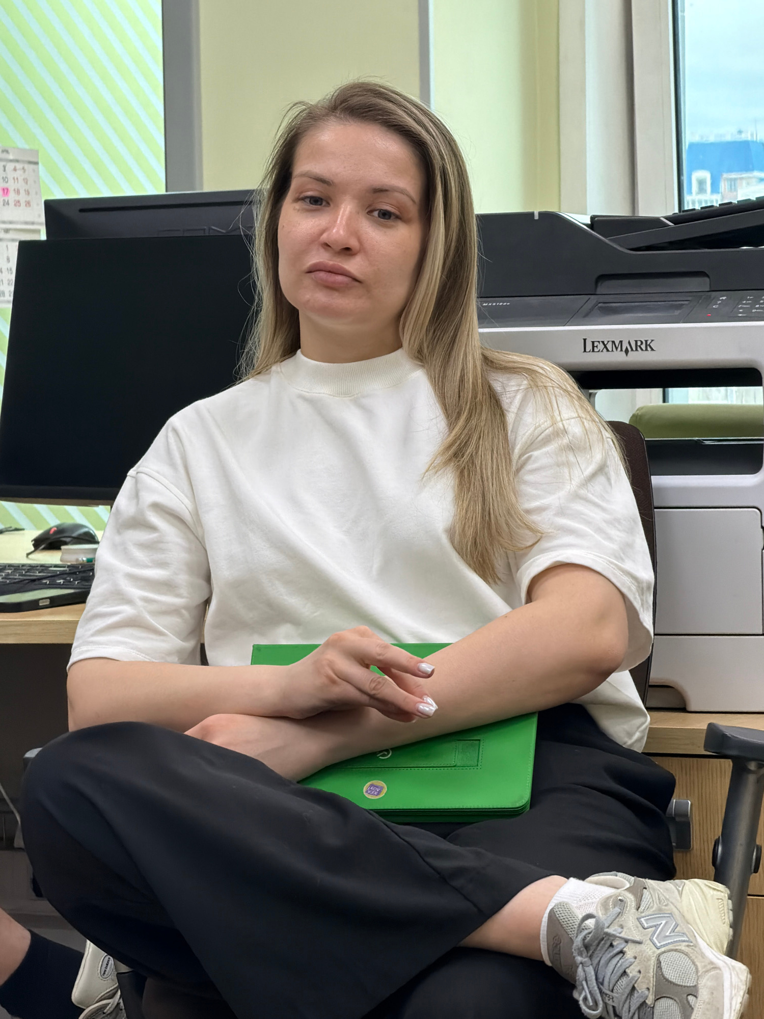 A fair-skinned woman with blonde hair is seated at a desk. She wears a white t-shirt and black pants. On her feet are grey and white sneakers. A green tablet rests on her lap. Behind her, a Lexmark pr…read more
