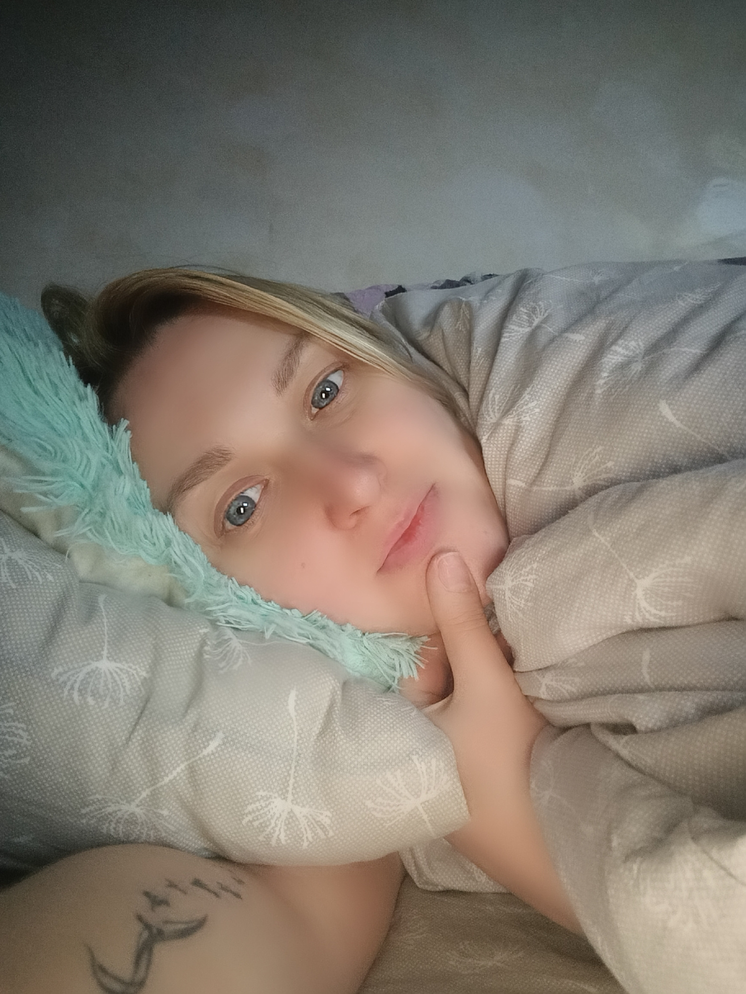 A fair-skinned woman with blonde hair and blue eyes is lying down in a bed. Her head rests on a pillow with a light grey floral pattern, overlaid with a fluffy turquoise pillow. She is partially cover…read more