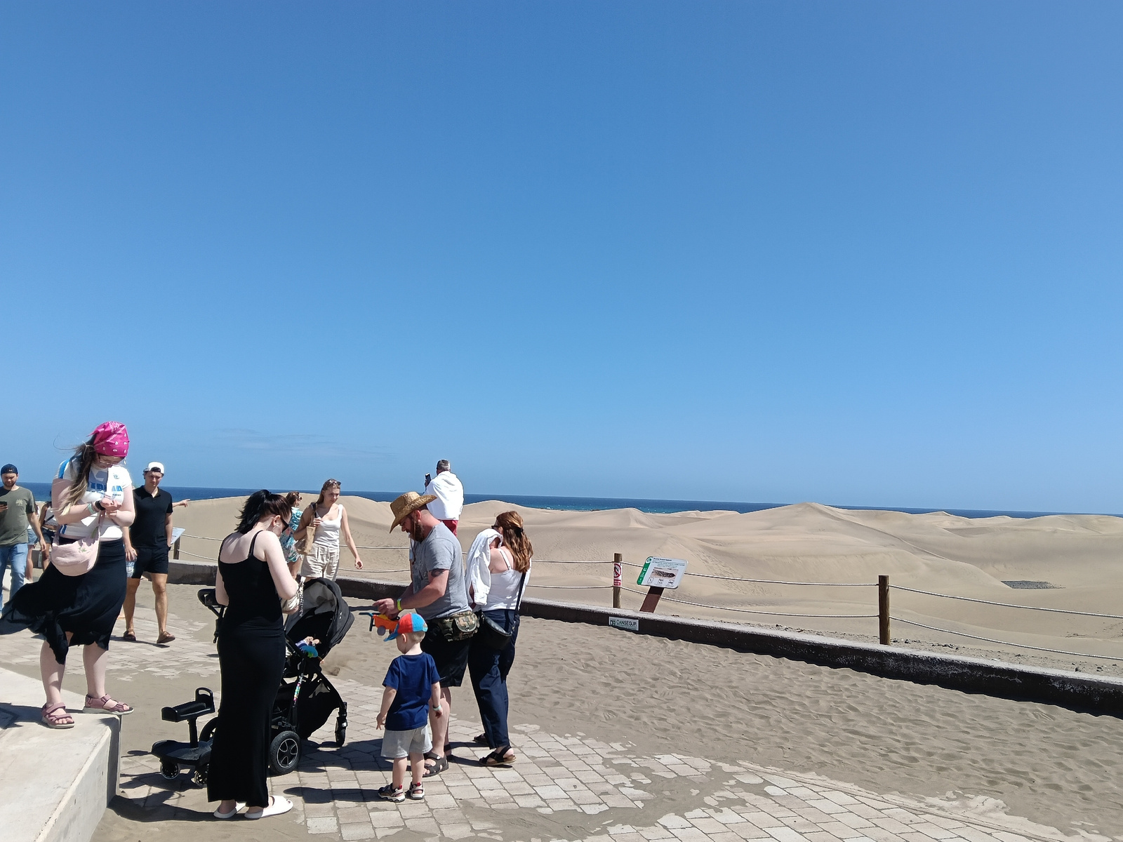 The image shows a group of tourists standing on a tiled walkway at the edge of the Maspalomas Dunes in San Bartolomé de Tirajana, Spain. The sky is clear and blue, and the sea is visible in the backgr…read more