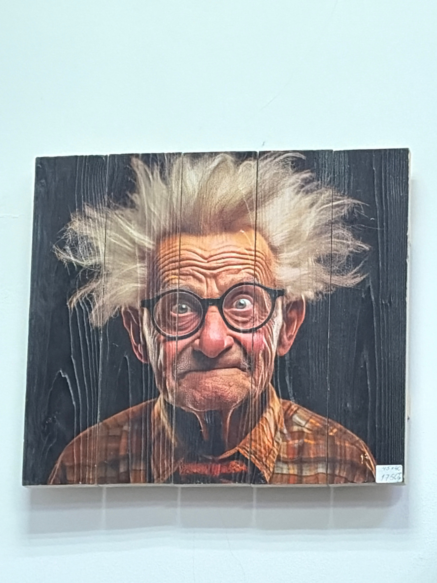The image shows a rectangular wooden plank picture hanging on a white wall. The picture depicts an elderly man with white, fluffy hair, eyeglasses, and wrinkled skin. He is wearing a plaid shirt. The…read more