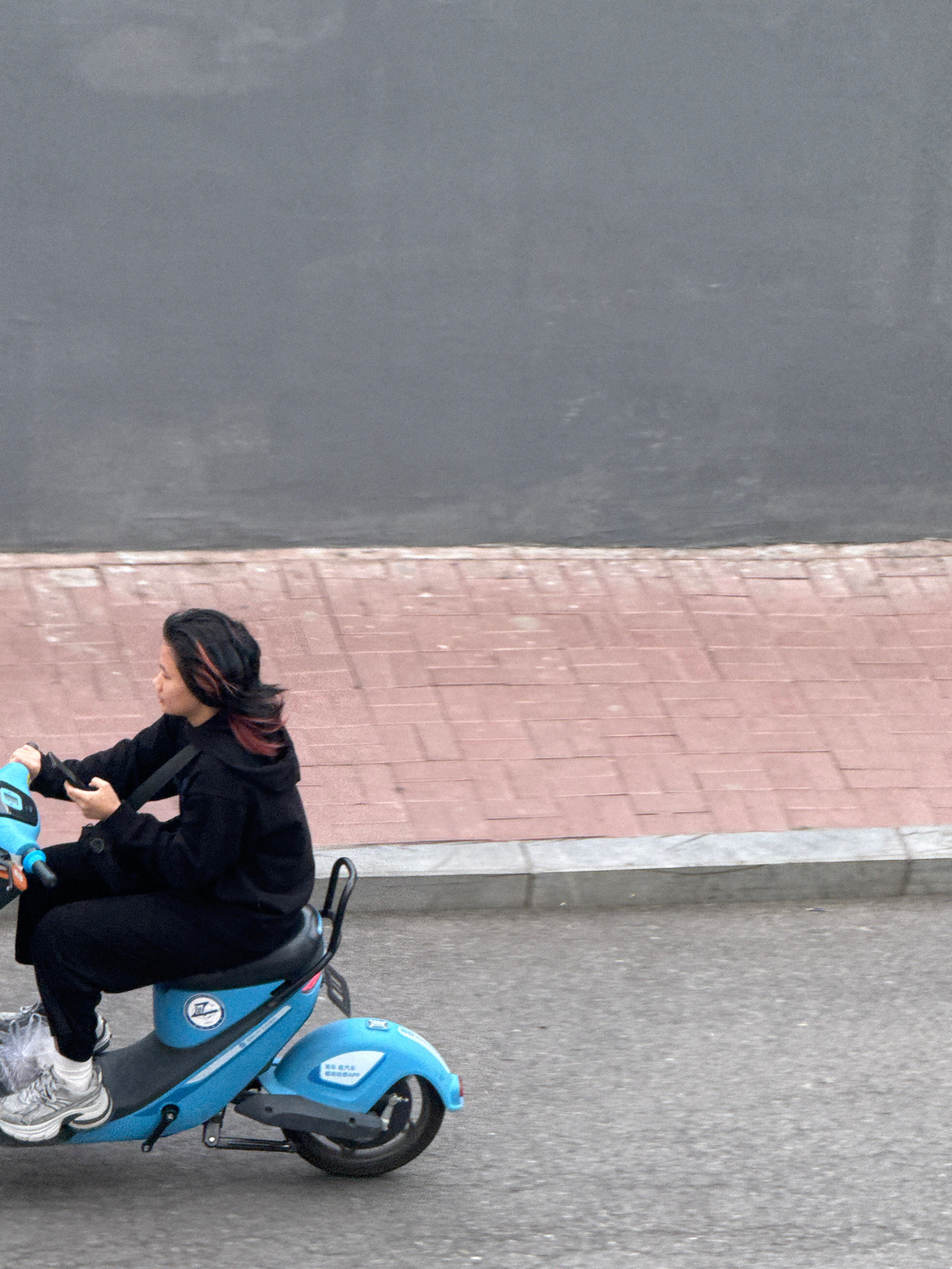 A person is bent over, interacting with a blue scooter parked on a sidewalk in Zhongtun, China. The sidewalk is bordered by a brick wall and a gray wall. The person is wearing a black jacket and pants…read more