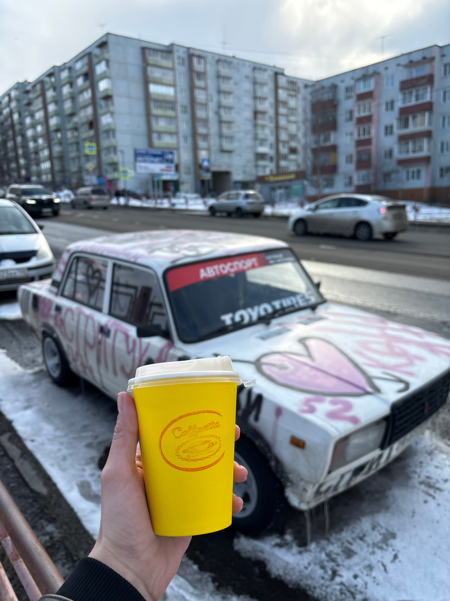 A hand holds a yellow "Coffletta" branded cup in Ust-Ilimsk, Russia. The backdrop features a street with cars, including a white vehicle marked with graffiti, and apartment buildings. The environment…read more