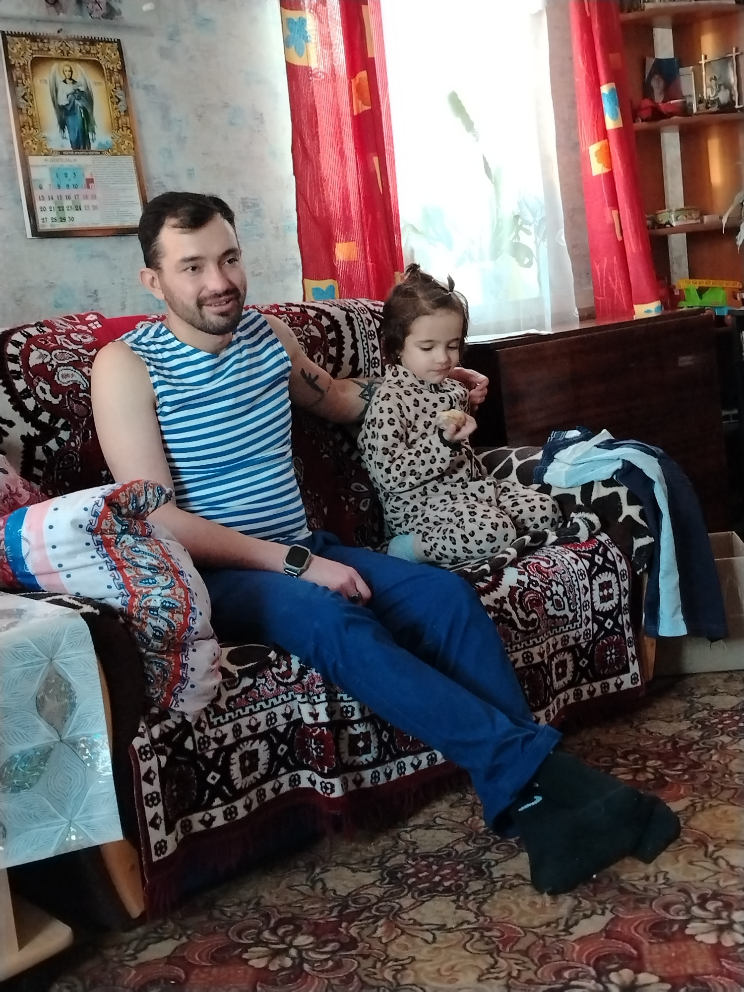 Here is a detailed description of the image: The image shows a man and a young girl sitting on a patterned couch. The man is wearing a blue and white striped tank top and blue jeans. He has dark hair…read more