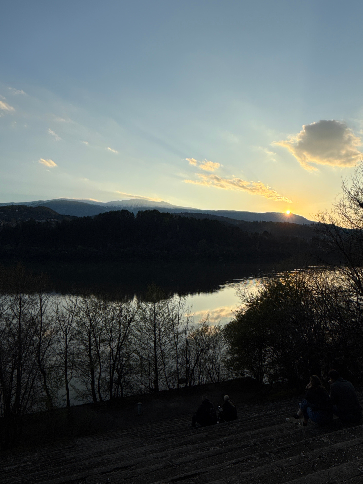 The image shows a landscape in Pancharevo, Bulgaria, at sunset. The sun is setting behind a mountain range, creating a silhouette. Light rays shine through the clouds. In the foreground, there are barβ¦read more