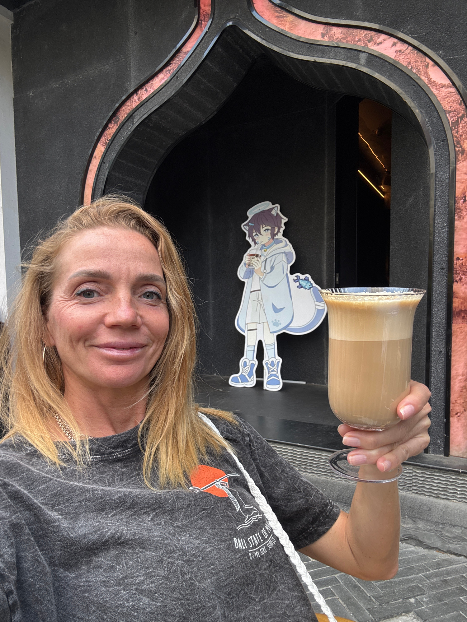 A woman with fair skin, blond hair, and wearing a gray t-shirt is holding a glass of coffee in front of a black doorway with an arched frame. Attached to the door, behind the glass, is a cartoon animeβ¦read more