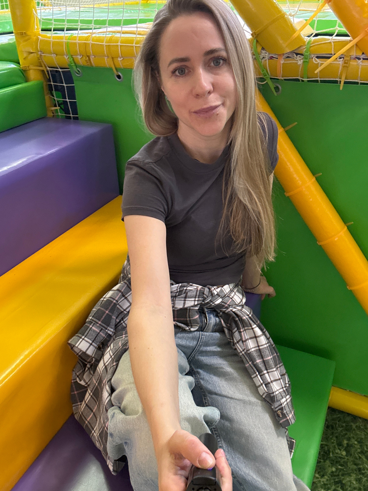 A woman is posing for a selfie in what appears to be an indoor play area with colorful structures, tubes, and netting. She has blonde hair and is wearing a dark gray t-shirt, jeans, and a plaid shirt…read more