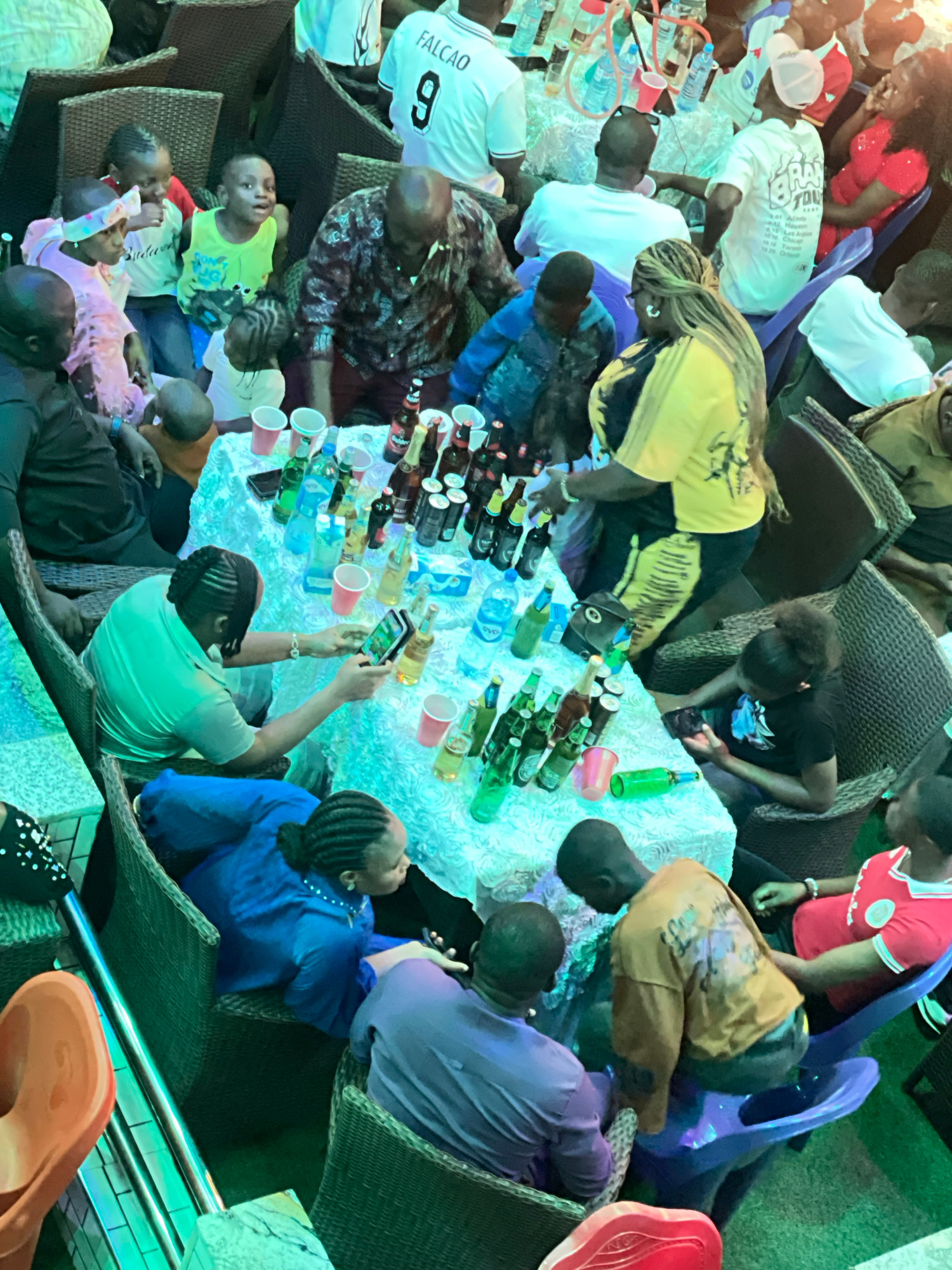 A gathering of approximately 15 people, including several children, are congregated around a table laden with bottles of alcoholic beverages and red plastic cups. The people are seated in wicker chair…read more
