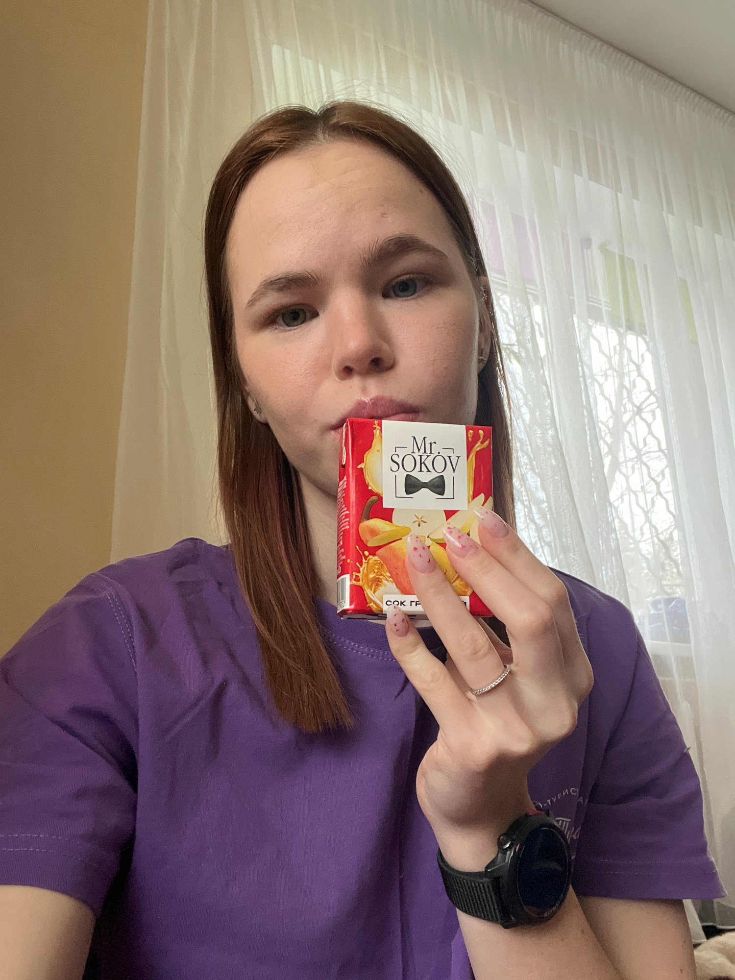 A young woman stands indoors, presenting a small, red and white juice box of "Mr. Sokov" brand. The juice box has a fruit illustration. The woman is wearing a purple t-shirt and a black smartwatch. Sh…read more