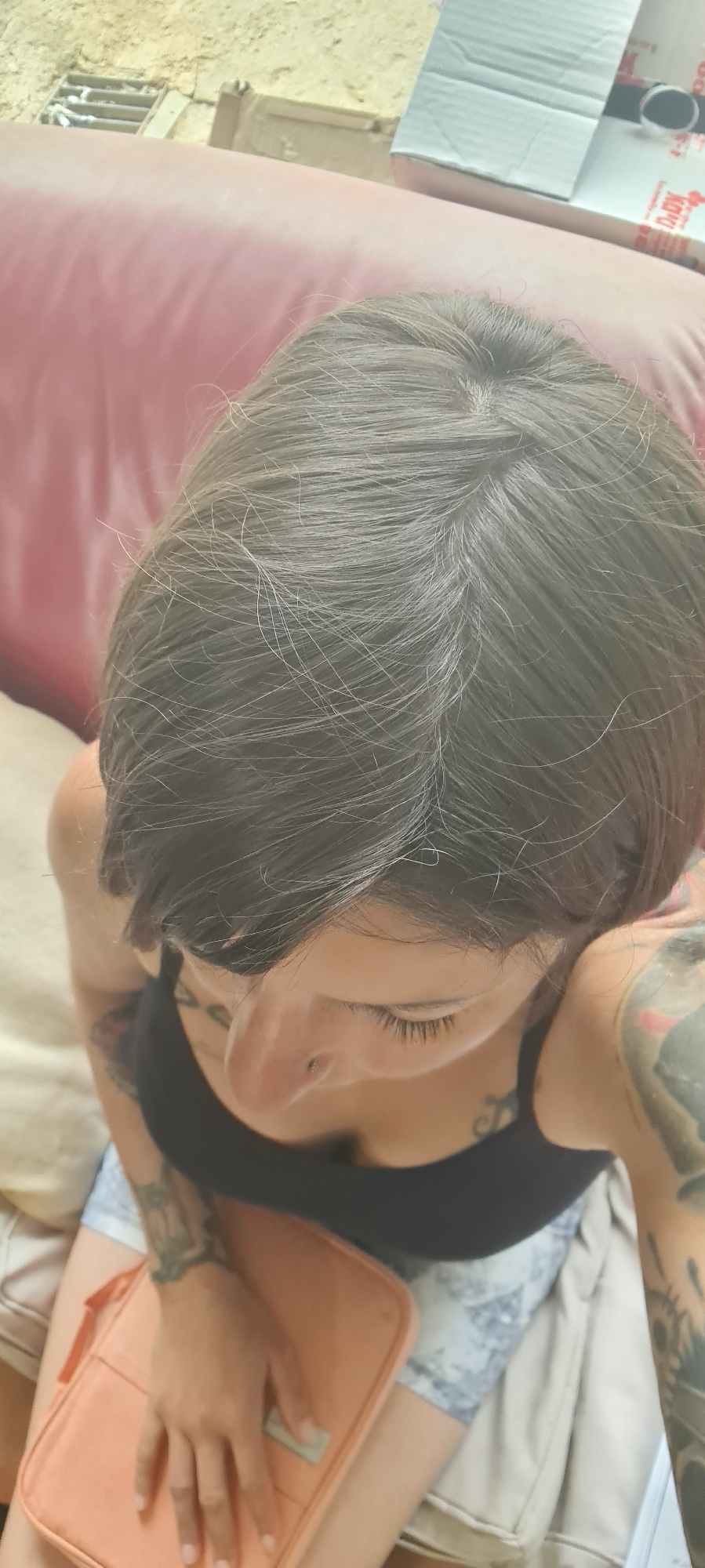 A person with tattoos lies on a surface with a pink cushion and tan material. They wear a black top and patterned shorts, holding a peach-colored zippered folder. The setting appears to be outdoors, p…read more