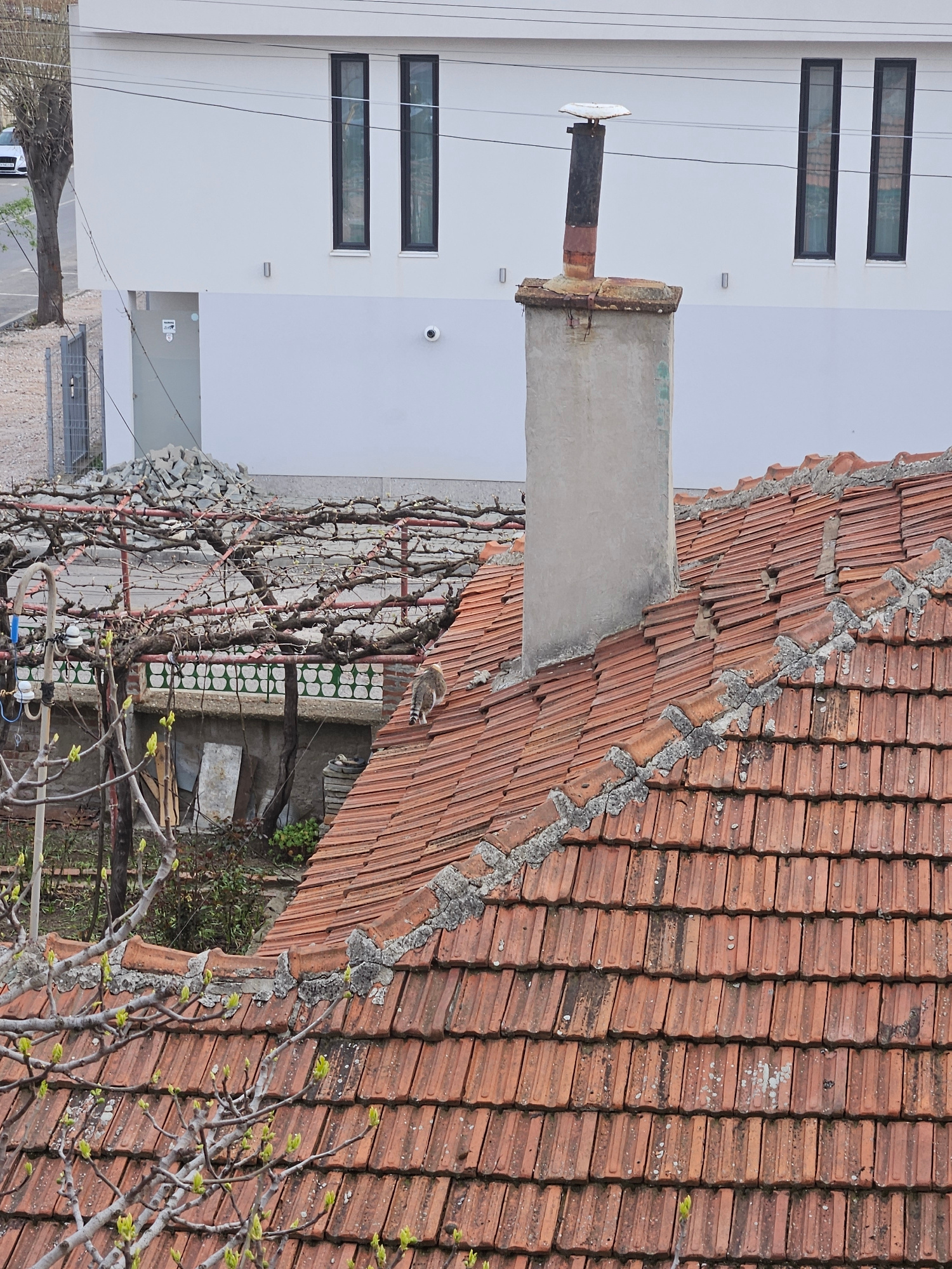 The image captures an elevated view of a terracotta tiled roof in the foreground, with a modern white building and overcast sky in the background. The prominent feature is a traditional reddish-orang…read more