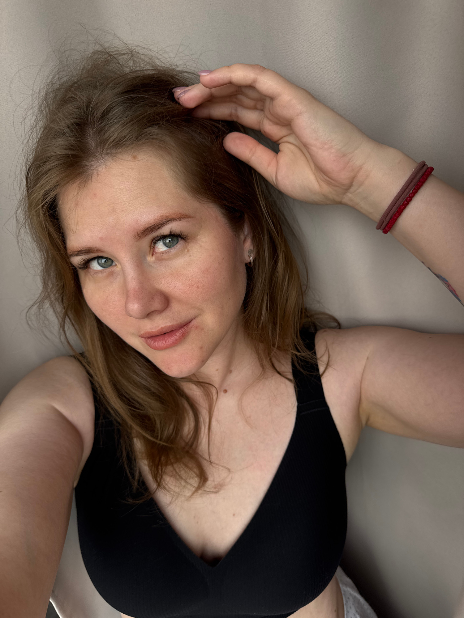 A woman with light brown hair and blue eyes is lying on a light beige surface, possibly fabric or a bed covering. She is wearing a black top. Her left hand is raised and placed near her head. A red br…read more