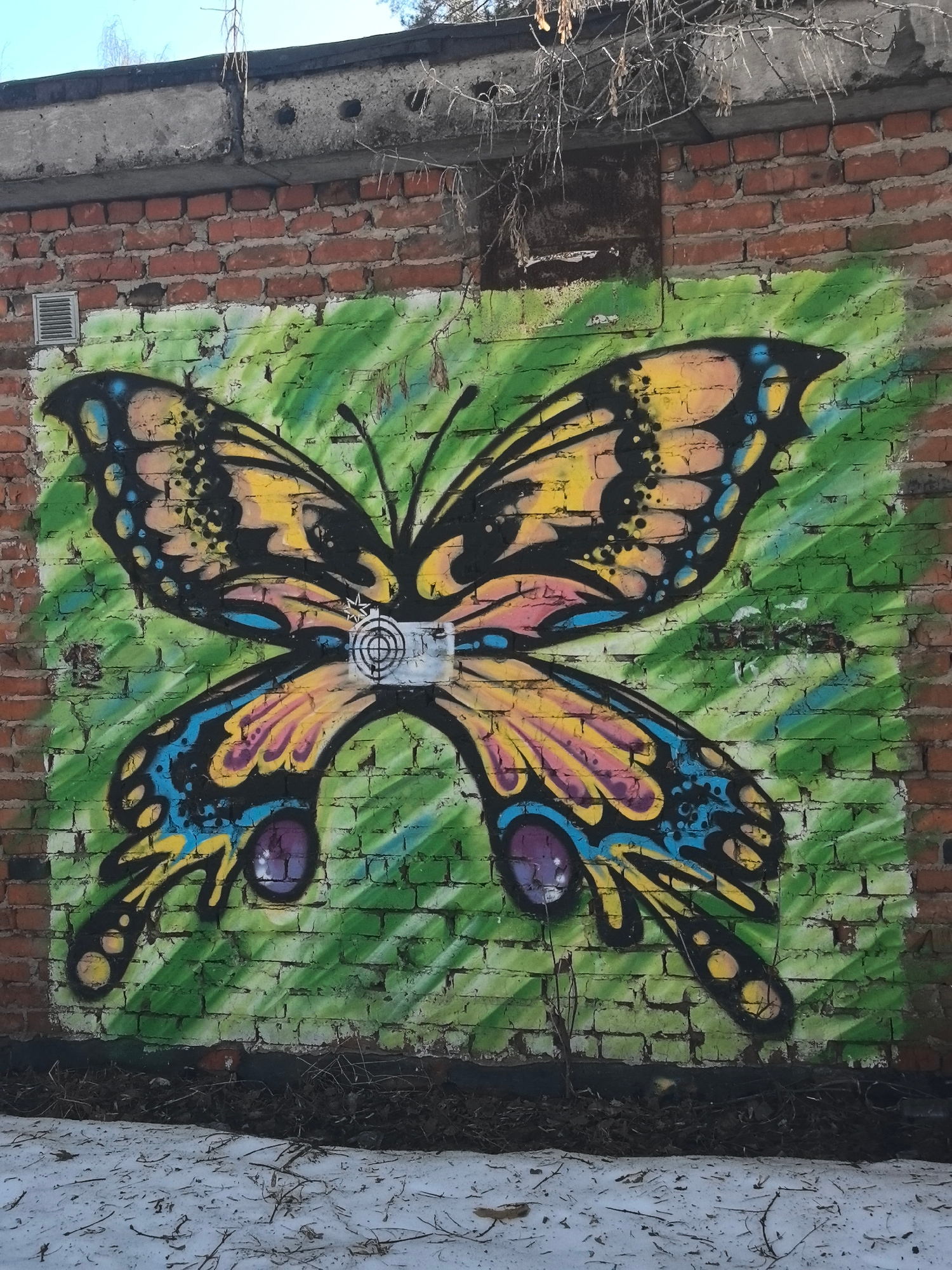 A colorful butterfly mural is painted on a weathered brick wall. The butterfly has yellow, pink, and blue markings outlined in black. A target-like design is placed at the butterfly's body. The backgr…read more