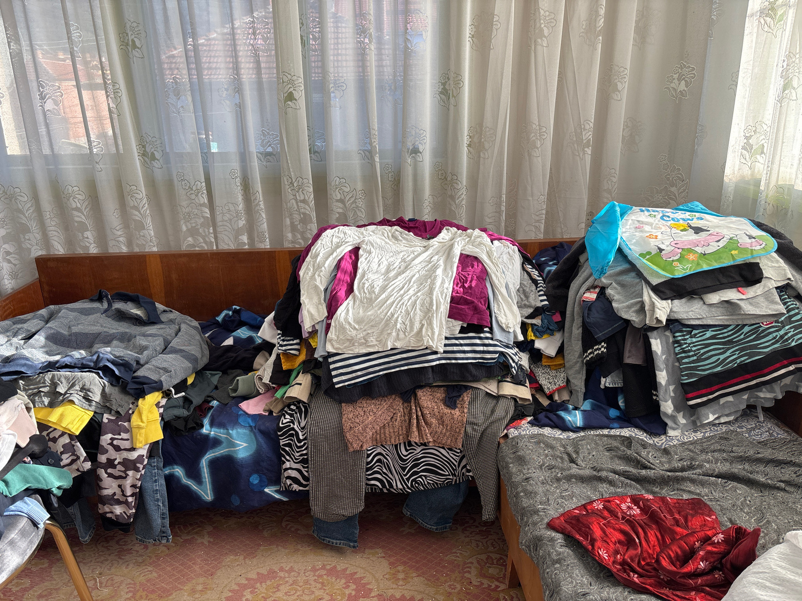 The image shows a disorganized interior, likely a bedroom, located in Kuklen, Bulgaria. The scene features two beds covered with mounds of unsorted clothing. The clothing piles are large and varied in…read more