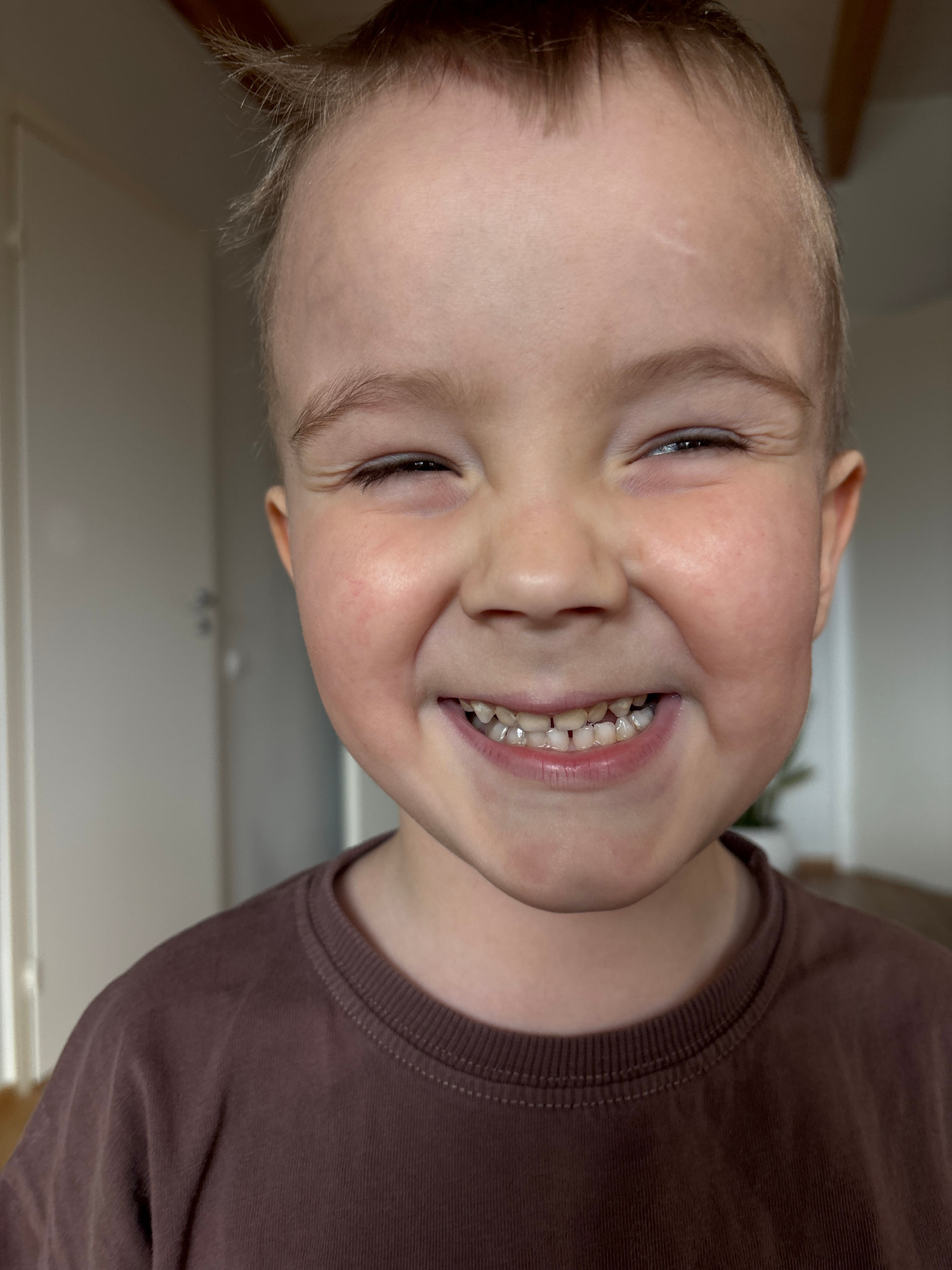 A close-up, angled portrait shows a young boy with blonde hair, fair skin, and a scar on his forehead, grinning widely and displaying his teeth. He is wearing a brown t-shirt. The background appears t…read more