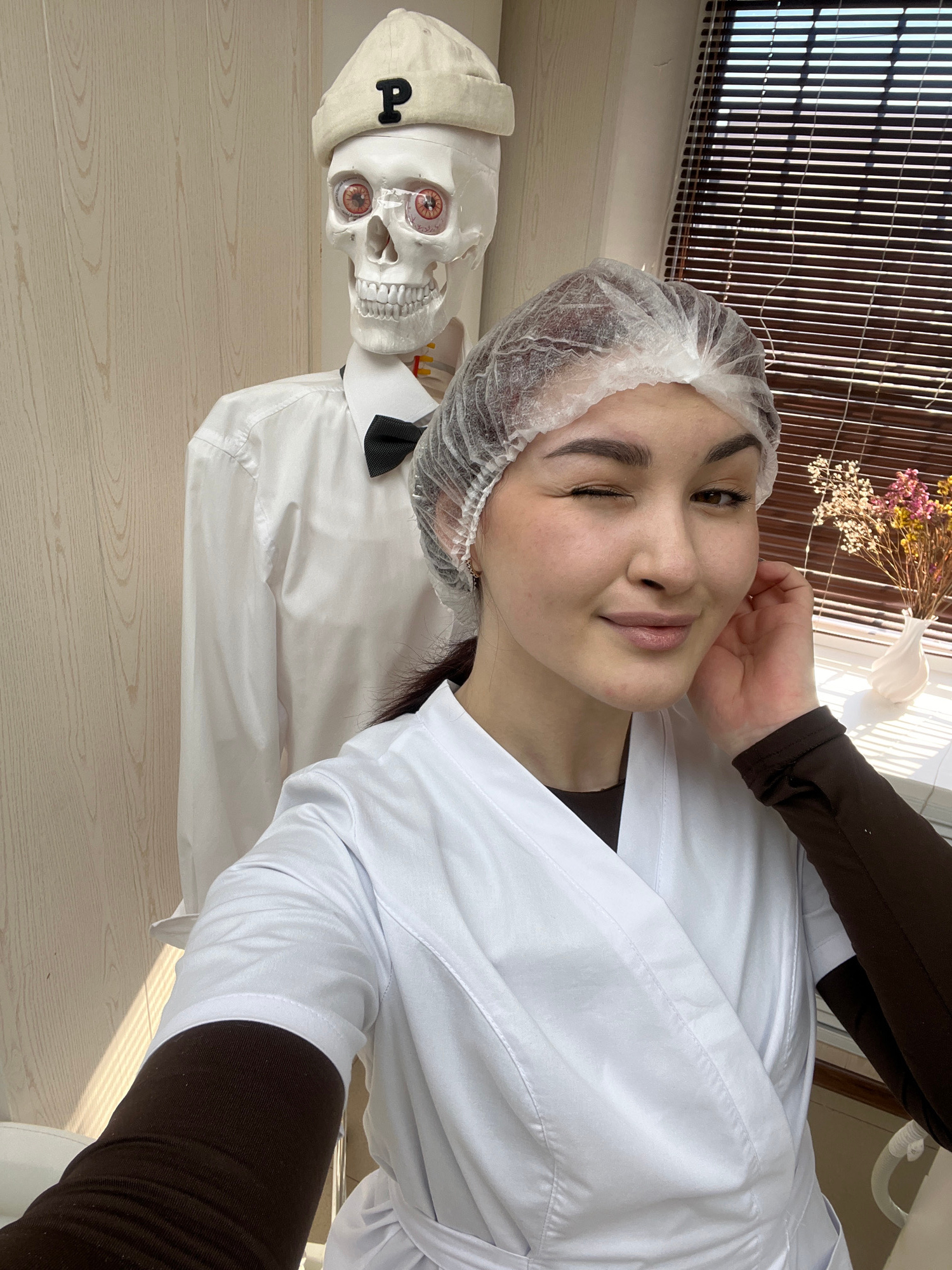 A young woman in a white lab coat and hairnet is posing for a selfie with a skeleton. The skeleton is wearing a white hat with a "P" on it, a white shirt, and a black bow tie. They are standing in fro…read more