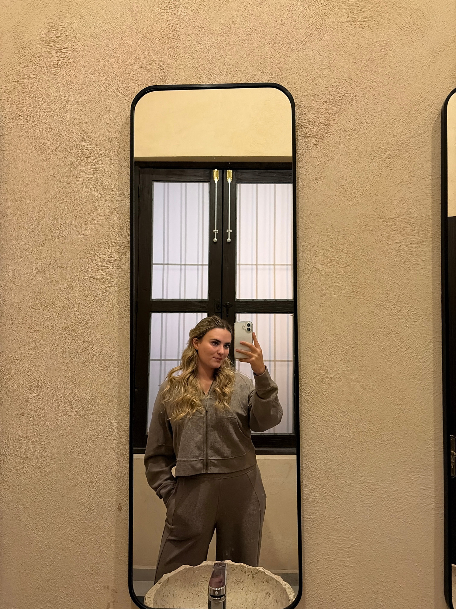A medium shot depicts a mirror with a black frame hanging on a beige textured wall. A person is reflected in the mirror, holding a smartphone and taking a selfie. The individual has long, wavy blonde…read more