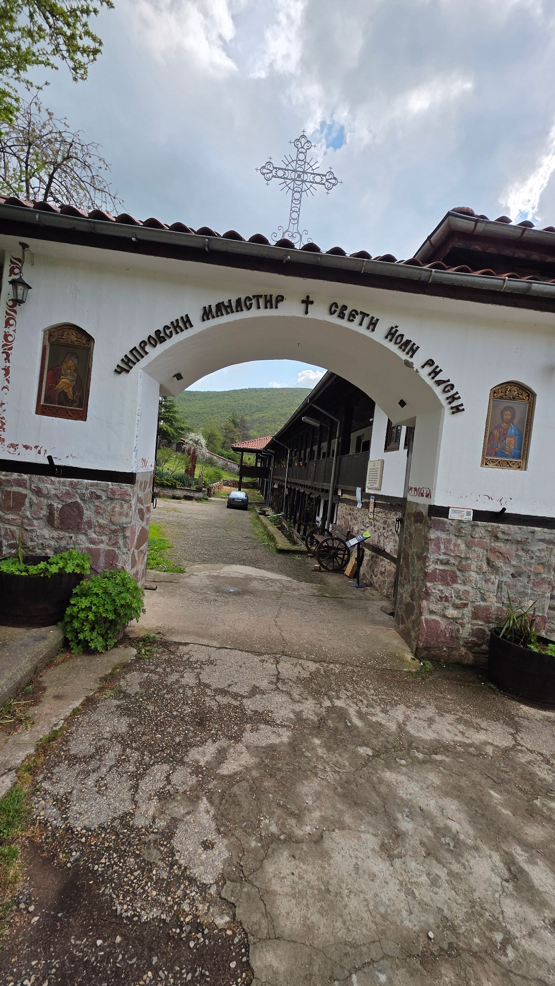 This outdoor shot, taken in Belimel, Bulgaria, captures the entrance to the Chiprovtsi Monastery. The structure is a white archway with Bulgarian Cyrillic writing. An ornate iron cross is mounted on t…read more