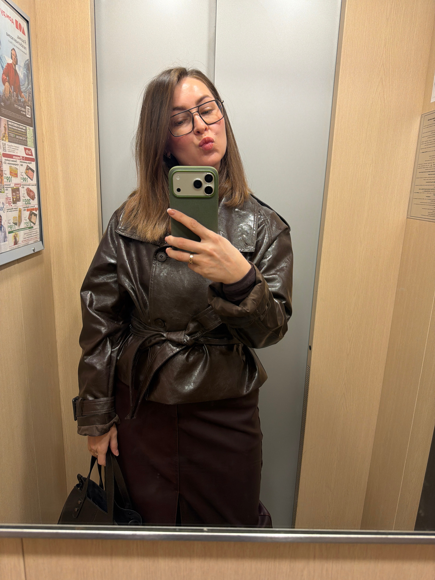 The image shows a woman taking a selfie in a mirror. She is wearing glasses, a brown leather jacket, and a brown dress. She is holding a green smartphone. A purse is visible in the reflection of the m…read more