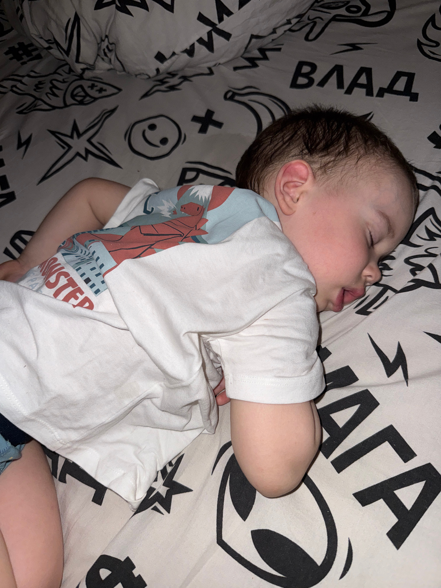 A toddler lies asleep on patterned bedding. The child is lying on their side, with their eyes closed and mouth slightly open. They are wearing a white t-shirt with a graphic design on one side. The be…read more
