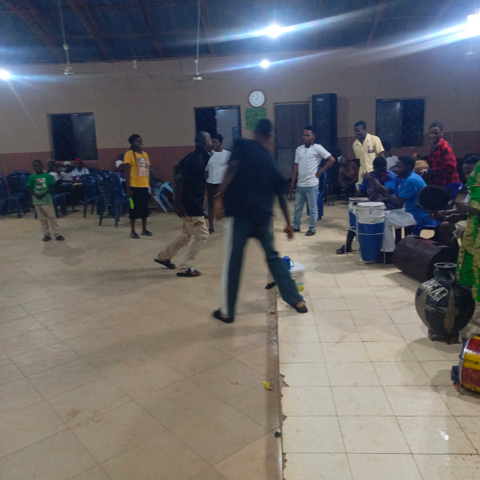 Akwanga, Nigeria. A large room with tile flooring and overhead lighting. A group of people are present. Some are seated in blue plastic chairs, while others stand or dance. Some people are playing dru…read more