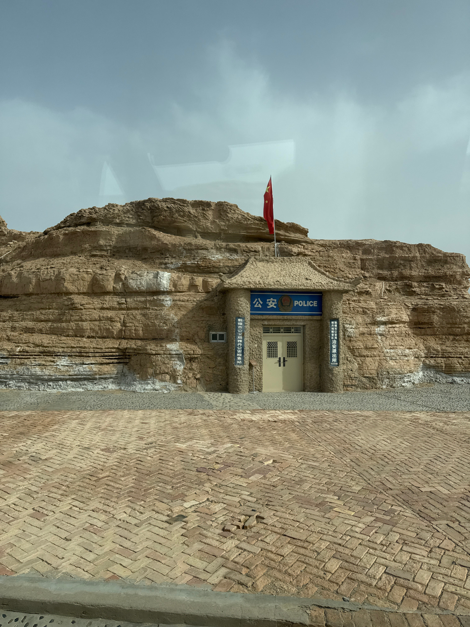 This media file captures a police station carved directly into a natural, light brown rock formation under an overcast or hazy sky. No people are visible in the scene. The police station entrance is…read more
