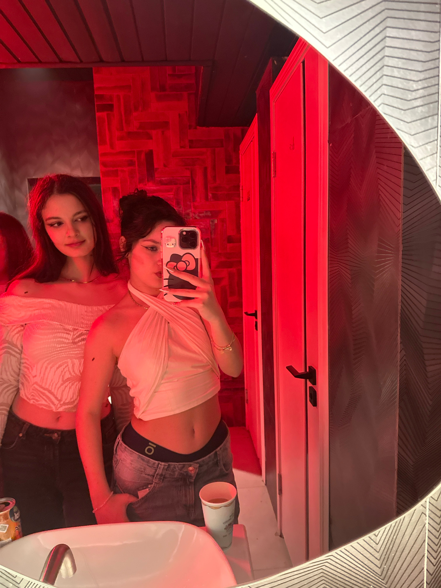 The image displays two young adult females inside a public restroom, likely within a commercial establishment in Yerevan, Armenia. The scene is illuminated by strong red ambient lighting. In the fore…read more