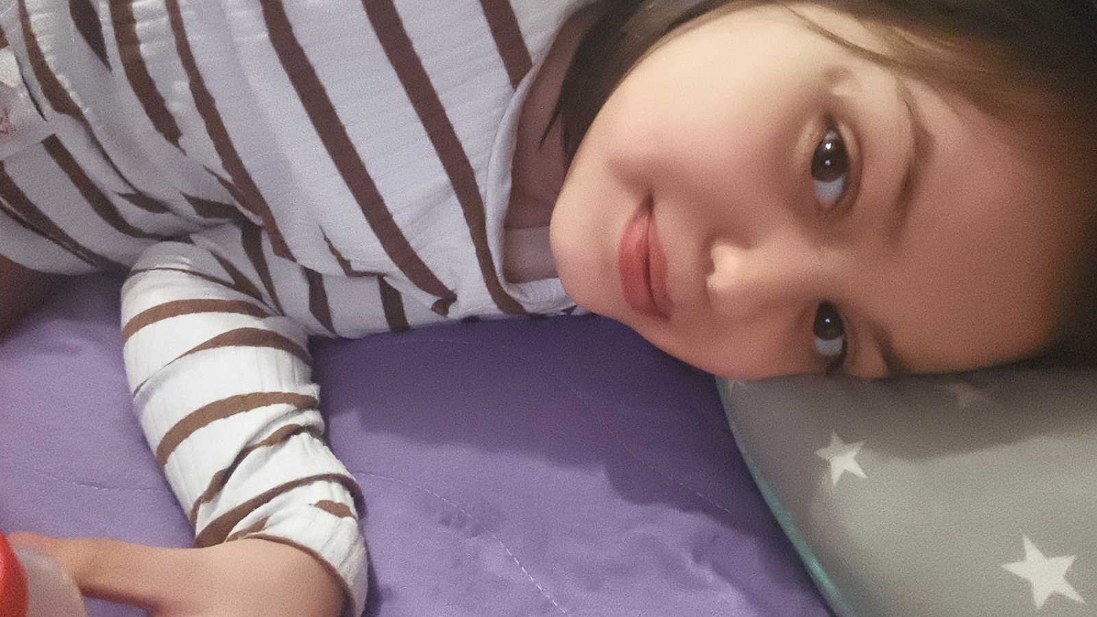 A child is lying on their side on a purple bed and a gray pillow with white stars. The child has brown hair and brown eyes, and is wearing a white and brown striped shirt. Their arm is extended in fro…read more