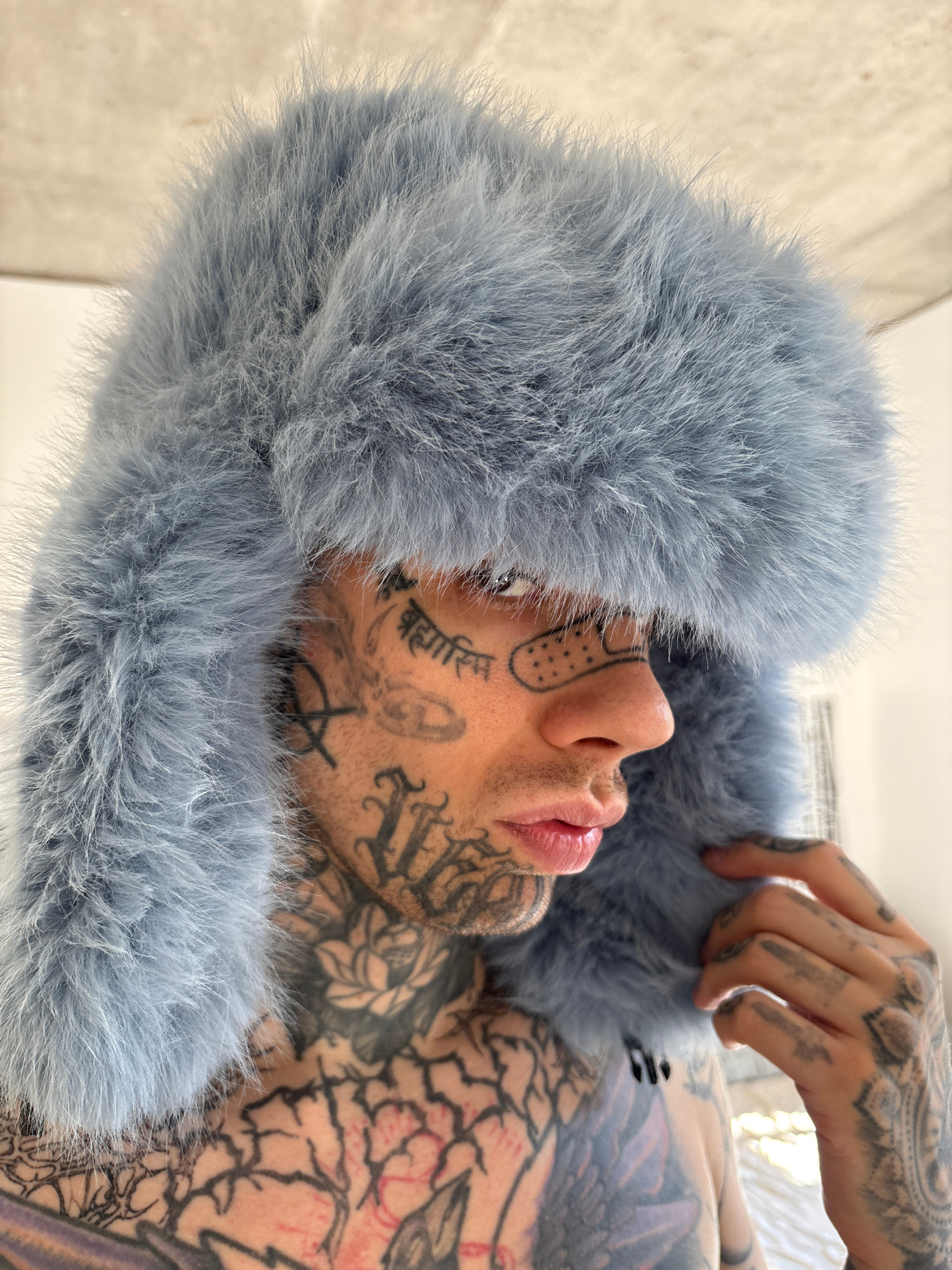 A pale-skinned person is lying down, their head adorned with a fluffy, light blue hat. The person is heavily tattooed on their face, neck, chest, and hands. The tattoos appear to be a mix of script, g…read more