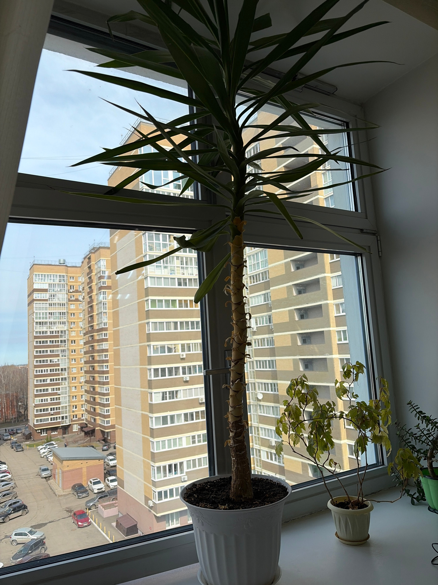 The image depicts a view from an apartment window. Inside, two potted plants sit on the windowsill: a yucca plant and a variegated ivy. Outside the window is a large apartment building with a light br…read more