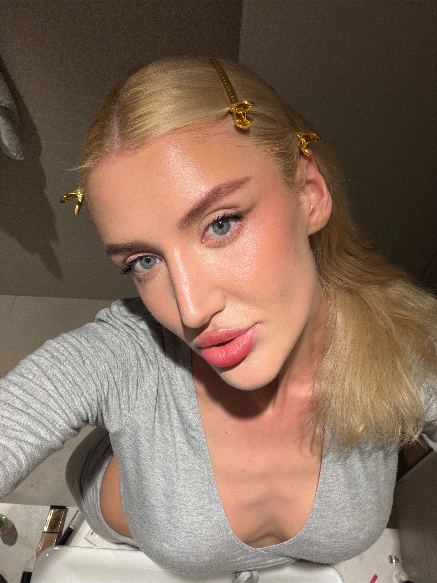 A fair-skinned blonde woman with light blue eyes is pictured indoors, likely in a bathroom. She is wearing a light gray, long-sleeved, ribbed top. Her blonde hair is held back with gold-colored hair c…read more
