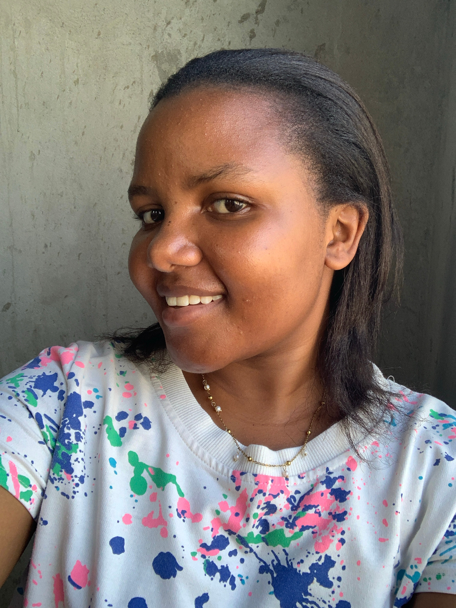 A young woman smiles at the camera, wearing a white shirt with splashes of pink, blue, and green paint. She is wearing a gold necklace. The background appears to be a gray wall. It is impossible to id…read more