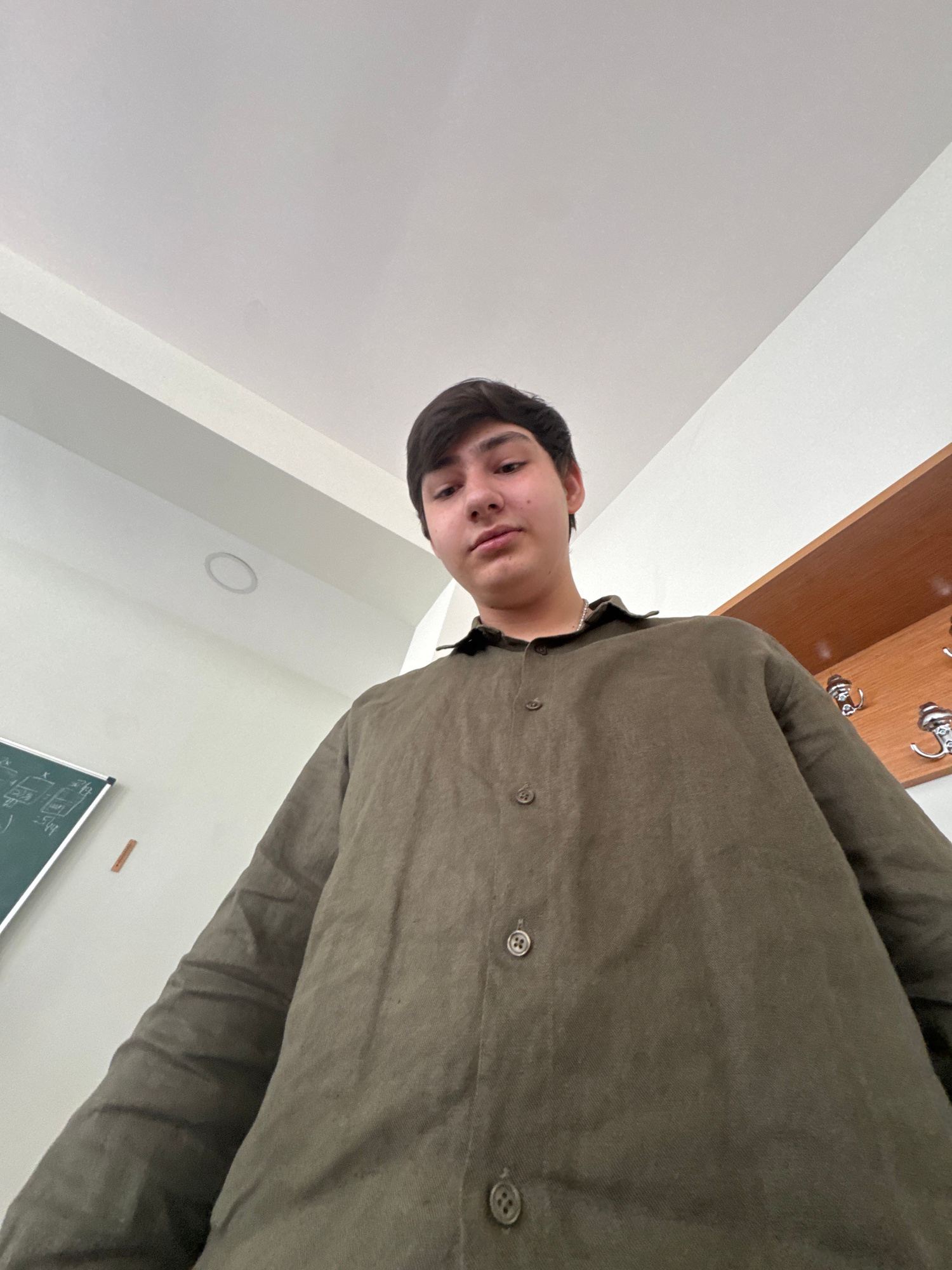 This low-angle image captures a young person, likely male, looking directly into the camera. The individual has short, dark hair and a neutral, slightly serious expression. They are wearing a long-sle…read more