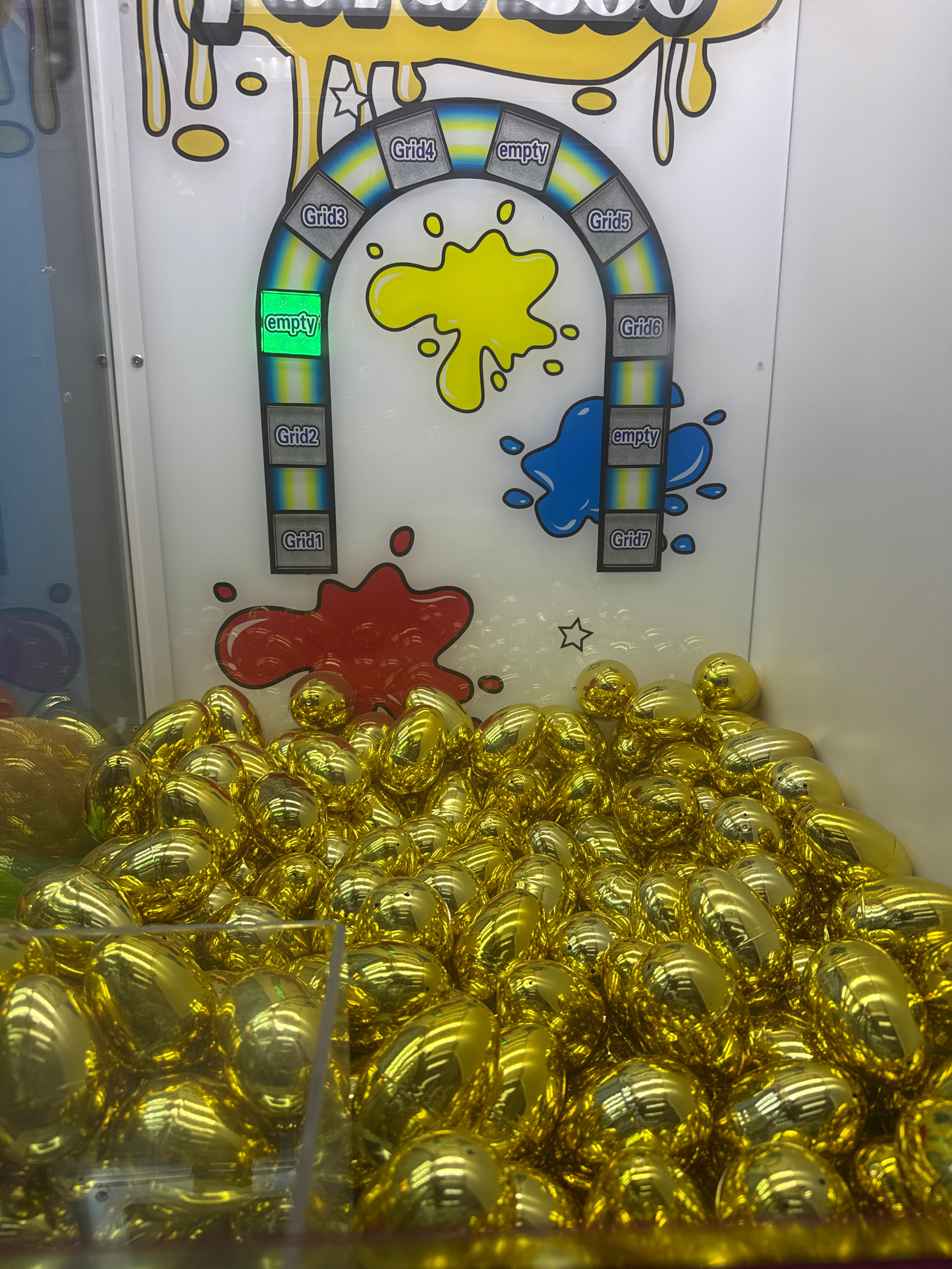An indoor scene in Sliven, Bulgaria, showcases a section of what appears to be an arcade game or prize vending machine. The right side of the image is dominated by a large pile of numerous shiny, refl…read more
