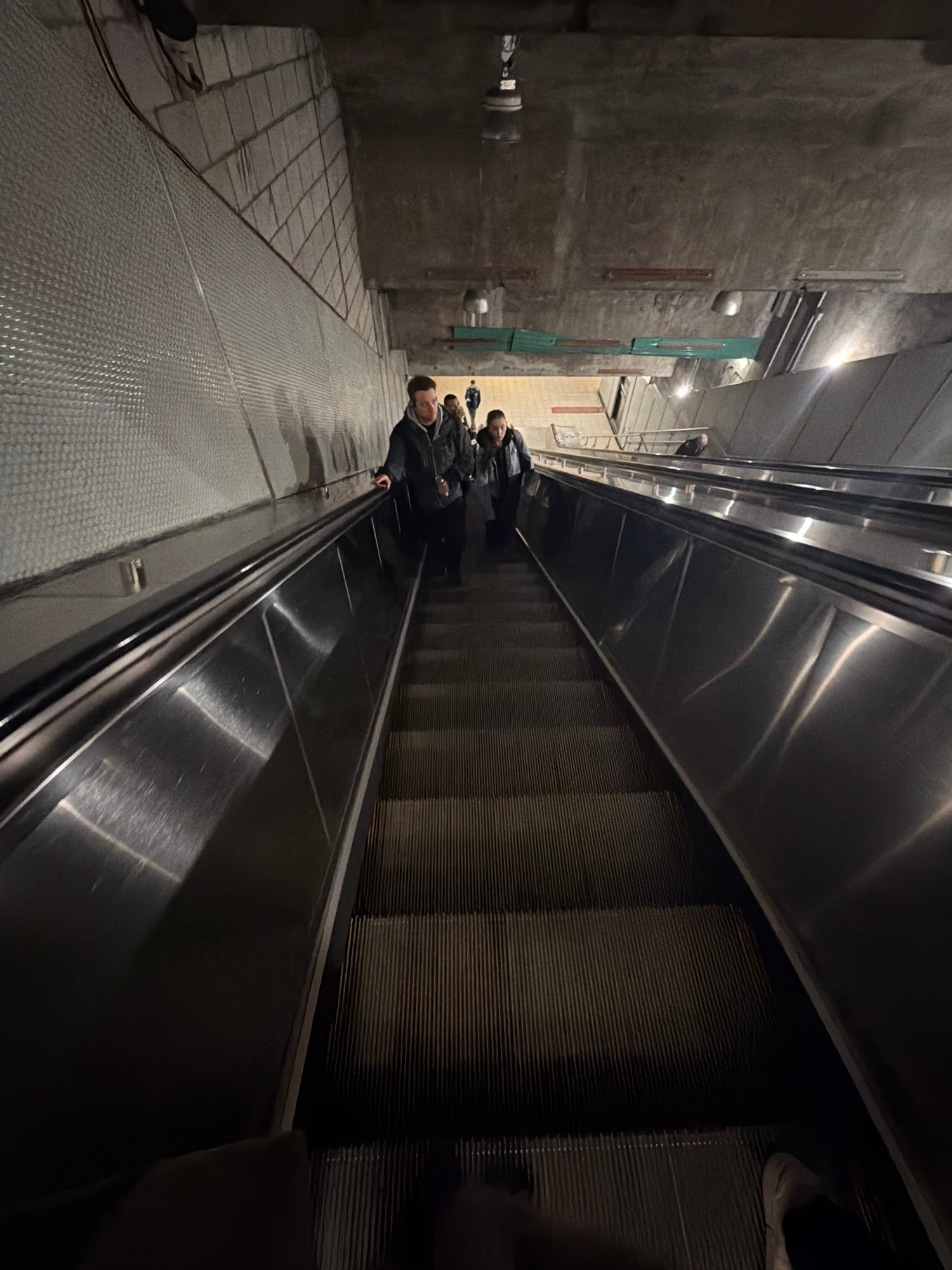 A low-angle perspective depicts an escalator in a transit station. The escalator is descending, with its metallic steps and side panels prominently displayed. Several individuals are using the escalat…read more