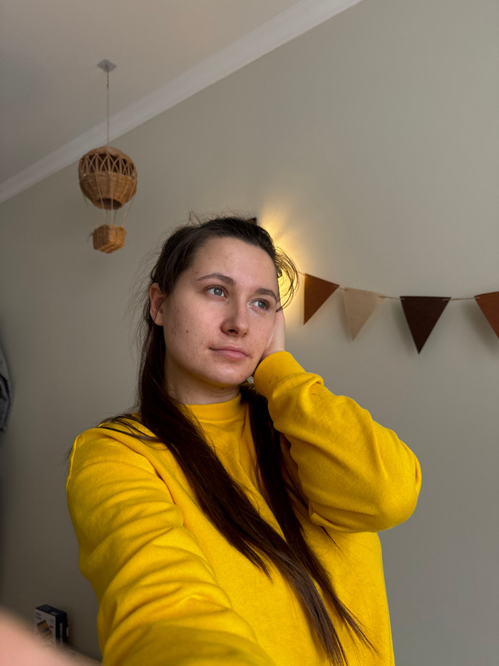 A young adult female, with long dark hair and a light complexion, is depicted from the chest up, wearing a bright yellow long-sleeved sweatshirt. Her left hand is raised, resting against the side of h…read more