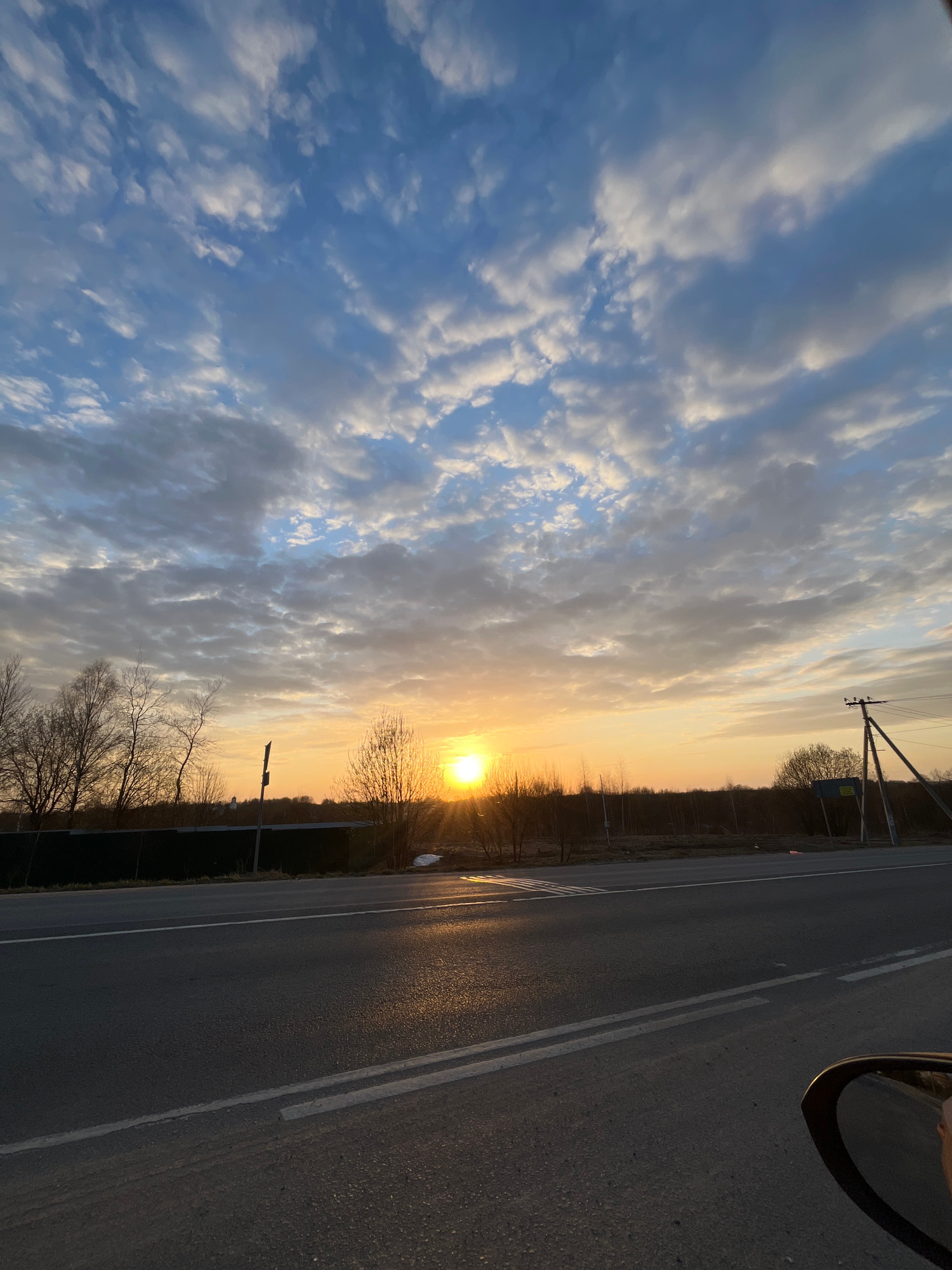 The image shows a view of the sky at sunset in what appears to be a rural area near a road. The sky is filled with clouds. The sun is low on the horizon. A road runs to the right side of the frame. A…read more