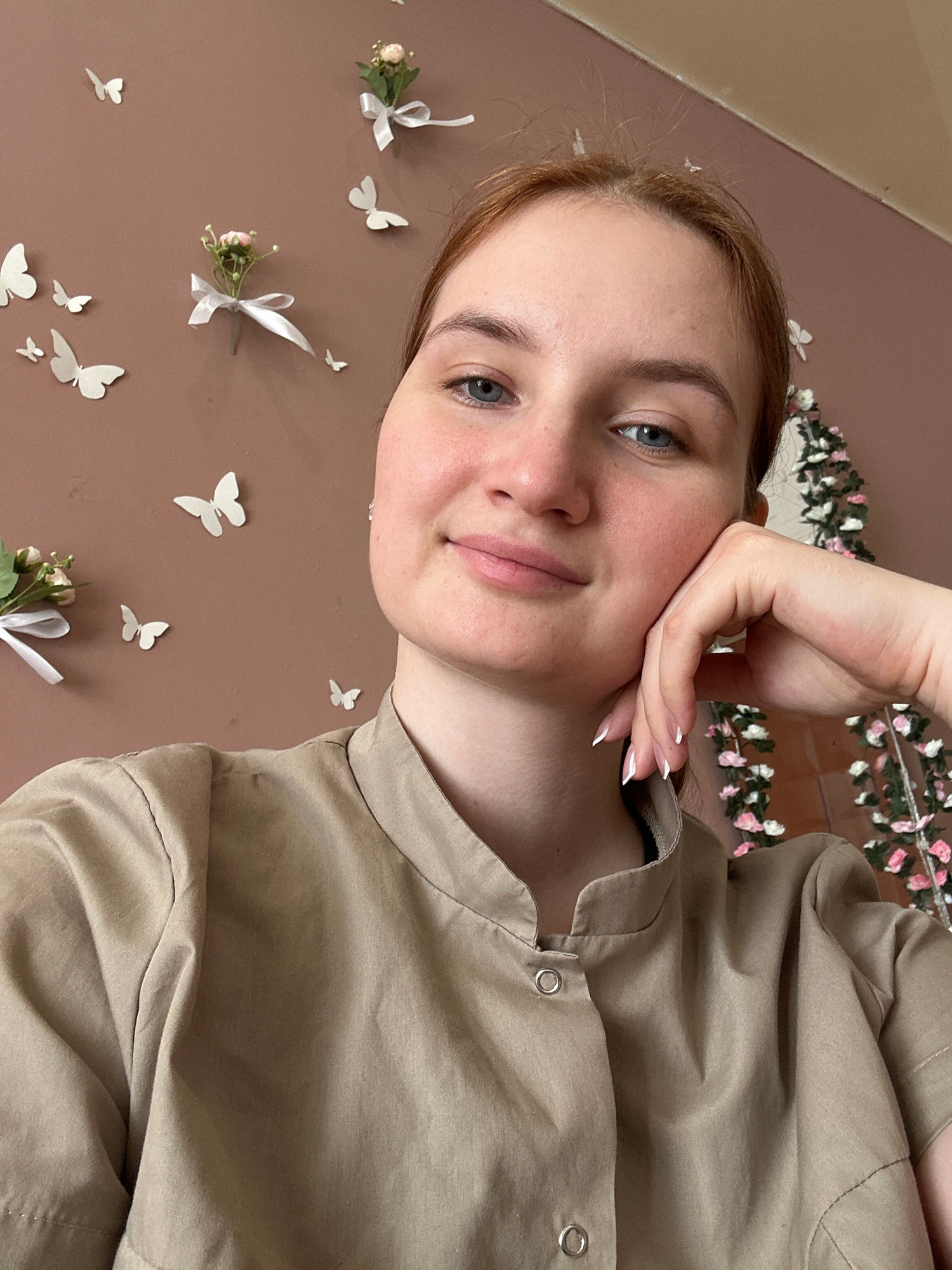 A young woman with light skin and auburn hair poses for a selfie. Her left hand is resting on her cheek. She is wearing a tan collared shirt with button details. The background features a light brown…read more